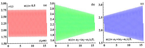Dependence of the PC dielectric permittivity on . (a) The non-apodized PC with , (b) the first-type apodized PC, and (c) the second-type apodized PC. The parameters are as follows: , , , , and .