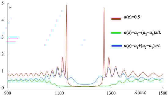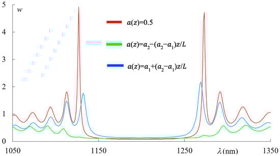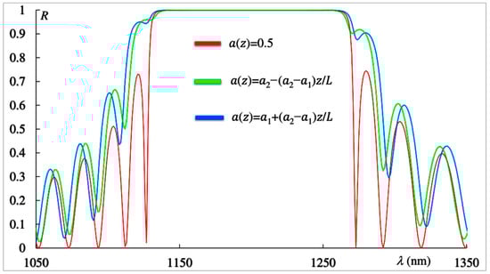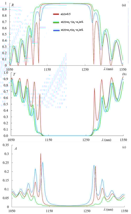 Nevertheless, it should be noted that there may be specific cases when the reflection spectra (as well as the transmission and absorption spectra) for two types of linear apodization with apodization laws (Equation (2)) and (Equation (3)) coincide. Indeed, if we choose a PC with thickness (where is an integer) and in Equation (1) instead of an odd function of z we take an even function of (for instance, , then, in the case of linear apodization and zero absorption, the spectra of a PC with the first type of apodization become identical to those with the second type of apodization. This is due to the fact that under such conditions, the rotation of the PC layer around the axis by 180 degrees does not change the symmetry of the problem, while in the case of an odd function at such a rotation, we do not obtain the same system. This is also confirmed directly by our numerical simulations.