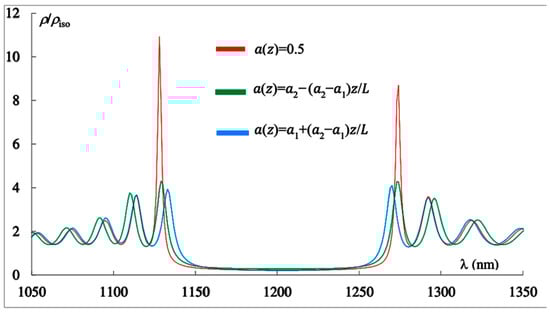 Figure 4 shows the spectra of the PDOS corresponding to the non-apodized PC (red curve), the first-type apodized PC (green line), and the second-type apodized PC (blue line). As can be seen in Figure 4, and as is well known, in the absence of apodization, exhibits two main maxima near the edges of the photonic bandgap (PBG), a maximum associated with the short-wavelength edge mode and another with the long-wavelength edge mode. This figure clearly shows that apodization significantly reduces both the short-wavelength and long-wavelength peak values of the PDOSs. Consequently, apodization substantially increases the lasing threshold for the corresponding edge modes, since the lasing threshold is inversely proportional to the PDOS [30]. The effect of apodization on the PDOS values at other edge modes is negligible.