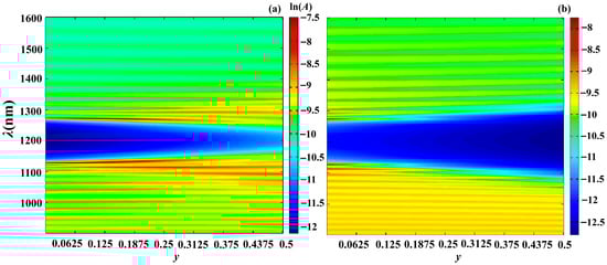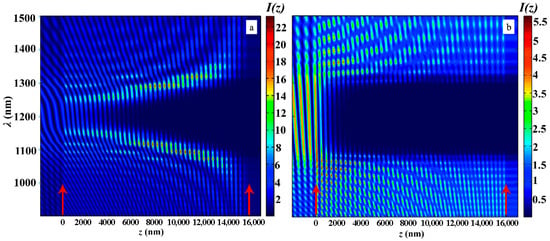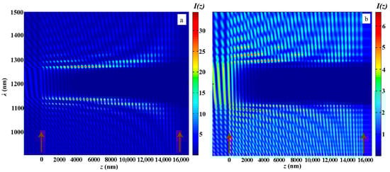 Figure 10 shows the same as in Figure 7 evolutions of the light intensity inside the PC layer when the coordinate z changes in the case of the second-type apodization (a) and in the case of the first-type apodization (b) at and .