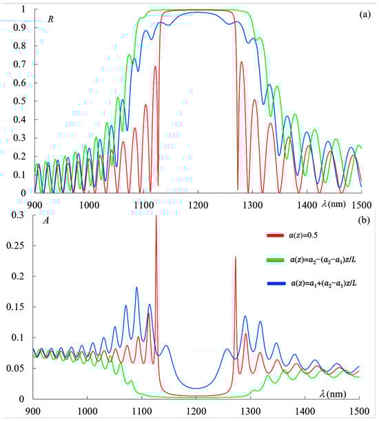 We now turn to the analysis of the results for larger slopes of the apodization function for a more complete understanding of the influence of apodization on the optical properties of PC. We consider the case where , and Figure 9 shows the reflection spectra (a) and absorption spectra (b) for these parameters, corresponding to the three cases of the dependence presented in Figure 2 in the presence of absorption with .