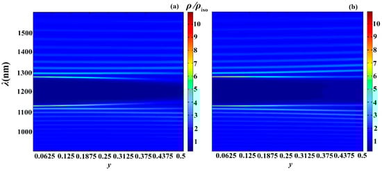 Next, to demonstrate the possibilities of apodization to tune the PC photonic properties, by expressing as and as we investigated the influence of varying on the reflection, absorption, and PDOSs spectra. Figure 12, Figure 13 and Figure 14 shows the evolution of the reflection, absorption and PDOS spectra, correspondingly, for the second-type apodization (a) and first-type apodization (b) as the parameter is varied.