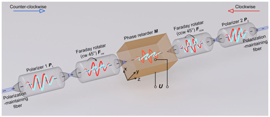 In contradistinction to the phase modulation technique with time delay, this scheme attains phase modulation by leveraging the inherent characteristics of the device. Consequently, there is no requirement to consider the transit time τ in the demodulation technique, and the transformer is not constrained by the Sagnac intrinsic frequency. Thus, it is easier to achieve a balance between the dynamic range and accuracy requirements. In Figure 1, the phase modulator is composed of a polarizer P1, a Faraday rotator Fcw (rotating 45°clockwise), a phase delay wave plate M, a Faraday rotator Fccw (rotating 45°counterclockwise), and a polarizer P2.