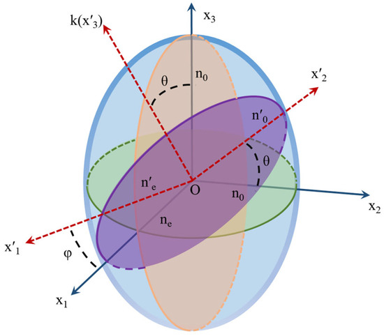 The spatial non-reciprocal phase modulation technique can be analyzed based on the concept of the refractive index ellipsoid [24]. The LiNbO3 crystal belongs to a negative uniaxial crystal, with its principal refractive indices n2 = n3 = no and n1 = ne < no. Suppose the angle between a plane light wave k passing through the crystal and the x1 axis is φ, and the angle between k and the x3 axis is θ. Therefore, the intersection line of the plane perpendicular to the light wave k and passing through the center of the ellipsoid must be an ellipse. Taking the (k, x3) plane as the x2Ox3 plane, a new coordinate system O-x′1x′2x′3 is established, as shown in Figure 2. The cross-section x′1Ox′2 can be written as