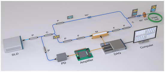 Figure 3 illustrates the comprehensive system architecture of a reflective all-fiber optical current transformer that integrates the spatial non-reciprocal phase modulation technique. The light wave emitted by the SLD light source is subjected to polarization through a polarizer. At this stage, it can be regarded that the polarization state of the light wave is vertically polarized light. The vertically polarized light wave is divided into two equal paths through a 2 × 2 polarization-maintaining fiber coupler. A light wave traversing a 90° fusion point results in a 90° axis alignment, thereby producing horizontally polarized light. The other light wave is introduced into the modulation phase (fast axis) through the spatial non-reciprocal phase modulator, which is vertically polarized light. Afterwards, the two beams of light are coupled into two linearly polarized light beams with perpendicular polarization directions in the polarization maintaining coupler, one is horizontally polarized light, and the other is vertically polarized light. Upon incidence at a 45° fusion point on the λ/4 waveplate, the two orthogonal linearly polarized beams are converted into circularly polarized light components with opposite rotation directions before propagating into the sensing section—one left-handed and the other right-handed.