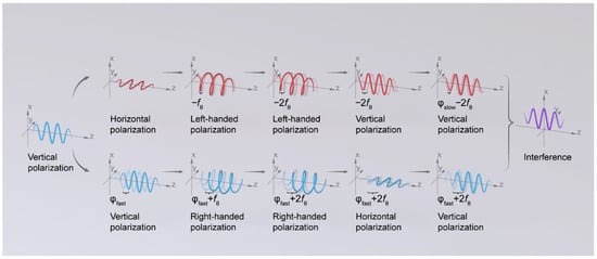 Therefore, the two circularly polarized light waves with opposite rotations entering the sensing part produce a non-reciprocal phase shift, increasing and decreasing by 2fθ. When two beams of circularly polarized light reach the reflection mirror at the end of the fiber ring, the originally left-handed circularly polarized light is converted to right-handed polarization, while the right-handed circularly polarized light is transformed into left-handed polarization. These altered beams then return to the sensing coil, resulting in a total phase shift of 4fθ. Subsequently, the light wave carrying sensing information is converted back into linearly polarized light through a λ/4 waveplate, with one being vertically polarized light and the other being horizontally polarized light with fast axis modulation phase, and the two beams of light have a difference of 4fθ. Vertically polarized light is introduced into the modulation phase (slow axis) via a phase modulator. After the polarizer in each of the two arms eliminates the repeated modulation of linearly polarized light, interference occurs at the coupler. The Faraday phase shift between vertically polarized light modulated by the fast axis and that modulated by the slow axis, which differs by a factor of four, leads to this interference, as shown in Figure 4.