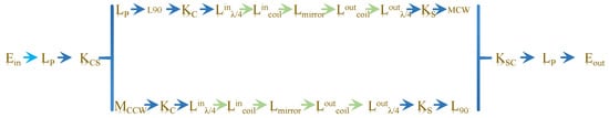 The matrix model of the AFOCT is shown in Figure 5, where Ein is the Jones matrix form of the incident light, Ks/c is the splitting ratio of the 1 × 2 coupler (without considering losses), Ksc/cs is the splitting ratio of the 2 × 2 coupler, LP is the Jones matrix of the polarizer, Lλ/4 is the Jones matrix of the λ/4 waveplate, Lmirror is the Jones matrix of the reflecting mirror, Lcoil is the sensing ring Jones matrix, and L90° is the Jones matrix of the 90° fusion point.