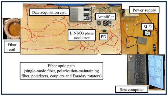 The experiment finalizes the construction of the optical path between the spatially non-reciprocal phase modulator and the reflective fiber current transformer discussed previously. The experiment set-up is equipped with the SLD (Yixun Photon Technology, YXSLD-1310SM-0-FA, Mianyang, China), PD (Thorlabs, DET01CFC, Shanghai, China), and LiNbO3 phase modulator (TJLiniom, PMT1300-P-P-FA-FA, Tianjin, China) and data acquisition card (National Instruments, USB-6353, Shanghai, China). Moreover, polarizers, couplers, and Faraday rotators are purchased from MC Fiber Optics in China Shenzhen. A commercially available amplifier is used to amplify the photoelectric signal collected by PD. The SLD source operates at 1310 nm with an output power of 10 mW. The half-wave voltage of the LiNbO3 dual-polarized waveguide is 4 V. The experimental set-up is shown in Figure 6. When combined with host computer software LabVIEW for signal modulation and demodulation, it forms a complete closed-loop detection device for fiber-optic current transformers. Due to the advantages of the spatial non-reciprocal phase modulation technique, high-frequency signals are not required for the modulated signal. At the same time, the selection of modulation waveforms is also very flexible. Sinusoidal signals, square wave signals, sawtooth wave signals, and triangular wave signals can all be used. The experiment used a 200 Hz sawtooth wave signal as the modulation signal. The functionality of the principal prototype is verified under DC current input through experimental procedures, followed by the completion of performance testing for the principal prototype.
