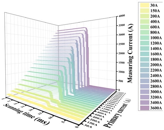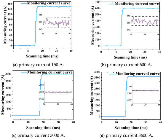 According to the testing conditions mentioned in the relevant standards, a total of 20 groups are conducted in the experimental environment. Except for small currents of 30 A and 150 A, the remaining step sizes are 200 A, covering rated currents (1–120%) to measure DC currents of 30–3600 A. The recorded current magnitude data of the experiment is the current variation graph saved by the LabVIEW host computer program, as shown in Figure 7. The transformer measurement maps for primary currents of 150 A (5%), 600 A (20%), 3000 A (100%), and 3600 A (120%) are given in Figure 8.