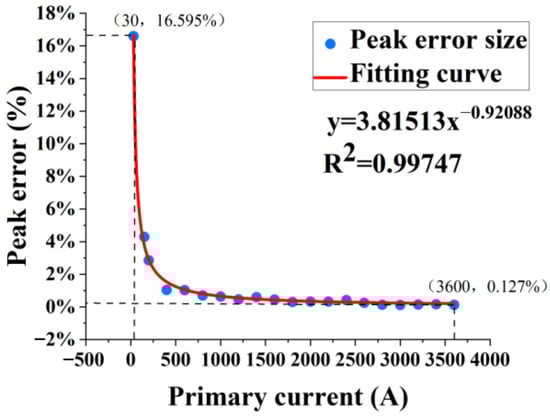 where Imax represents the maximum detection output at the rated operating point, Imin represents minimum detection output at rated operating point, and IR represents rated primary current size. The peak error diagram of the AFOCT is shown in Figure 10.