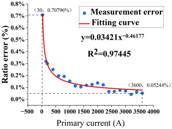 where YFS represents the range, and ΔLmax represents the maximum error. As illustrated in Figure 9, each discrete point within the figure represents the average magnitude of the detection results corresponding to a specific current. The linear regression R2 of the transformer output fitting curve in the figure is 1, with a linear slope of 0.999 and a zero-point deviation of 0.552, indicating that the prototype has good measurement consistency. Consequently, δL is approximately 0%.