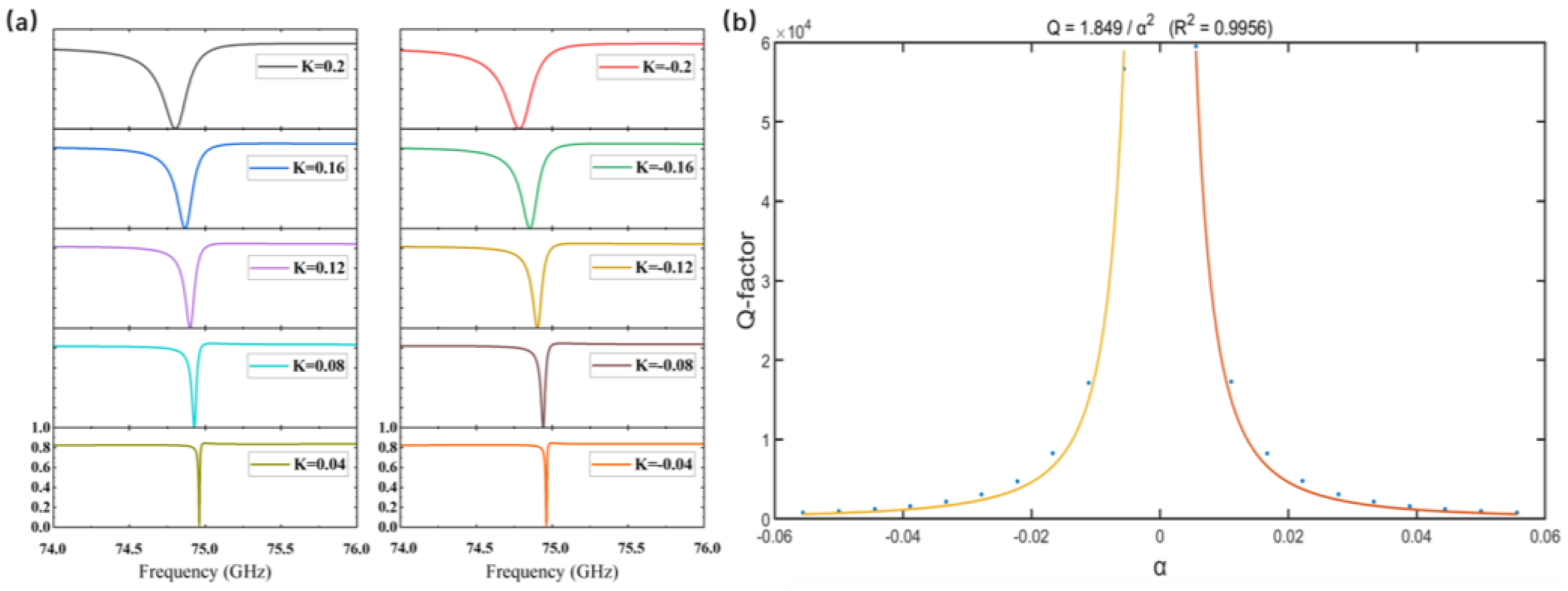 Figure 2b is located at 74.92 GHz and clearly exhibits an asymmetric Fano line shape. Fano resonances originate from the coherent interference mechanism between a discrete state and a continuum state within the same radiation channel. When a narrowband discrete resonance spectrally overlaps with a broadband continuous background, the coherent superposition of their radiation amplitudes can give rise to destructive interference at specific frequencies, thereby producing an asymmetric Fano line shape [