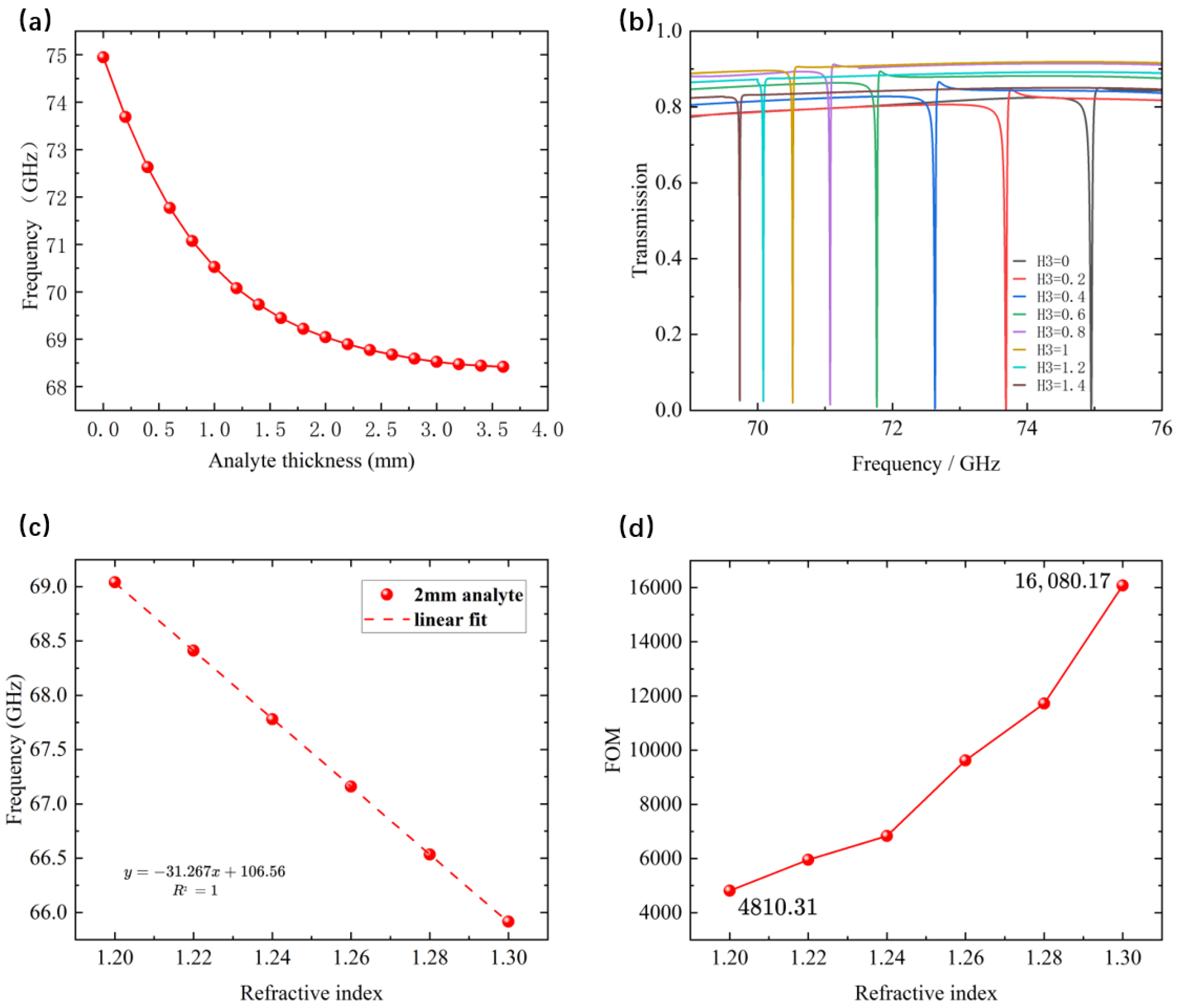 is the resonance frequency of the metasurface without the analyte. Based on the fitting results, the proposed metasurface achieves a refractive-index sensitivity of 31.267 GHz/RIU, demonstrating an exceptionally high responsiveness to refractive-index variations.