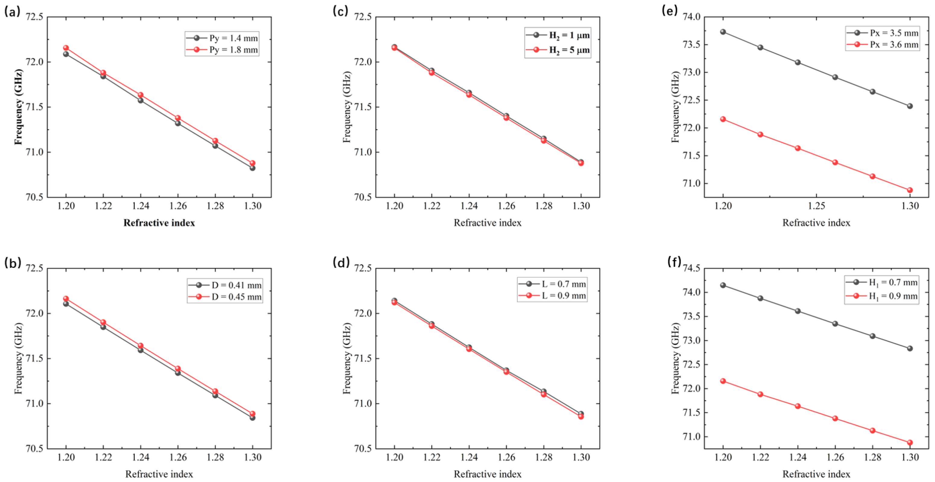 Figure 7. Specifically, following a procedure similar to that used in the analysis of structural-parameter effects on the transmission spectrum, one structural parameter is investigated at two different values while all other parameters are kept constant. Under the condition that the thickness of the analyte layer is fixed at 0.5 mm, the resonance frequency shifts induced by variations in the refractive index are extracted and compared. The results reveal that, despite the different parameter values considered, the magnitudes of the frequency shifts are nearly identical, which is manifested in
