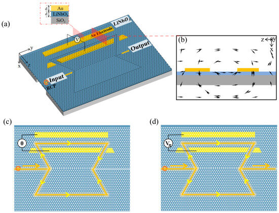 The conceptual demonstration of the MZI EOM based on the VPC structure is shown in Figure 1a. The MZI structure is constructed by two Ω-shaped topological waveguides formed by combining two mirror-inverted VPC structures, which compose triangular airholes in the free-standing TFLN substrate. The gold electrodes are deposited on both sides of one waveguide (3 μm apart) to apply an electric field. Compared with Al and TiN, gold exhibits higher electrical conductivity and superior chemical stability. Additionally, the fabrication process for gold electrodes is well-established and has been widely adopted in lithium niobate modulator research. The strong electro-optic (EO) effect of LN can introduce refractive modulation in response to an external voltage, thereby producing a phase difference between the two waveguides. The simulated electric field distribution (using COMSOL Multiphysics 6.2 software) is shown in Figure 1b. The thin-film design enables the strongest electric field to cross the waveguide, thereby minimizing the required voltage. The proposed device employs a single-arm modulation scheme. The working scenarios are schematically shown in Figure 1c,d, in which the incident beam is split at the first Y-junction and combined to interfere at the second Y-junction. The line and arrows indicate the optical paths. The interference results are decided by the phase difference φd between the two waveguides (arms). The EOM is designed to achieve destructive interference (φd = nπ, n is an odd number) when the external voltage is 0 V (Figure 1c), and constructive interference is achieved when a HWV is applied, resulting in a phase difference of φd = 2 nπ, where n is an integer. This design employs a 220 nm-thick x-cut LN thin film to exploit the largest EO coefficient (r33) [25]. Due to the Pockels effect, LN exhibits an EO response with a direct current (DC) electric field [38], which can be formulated as follows: