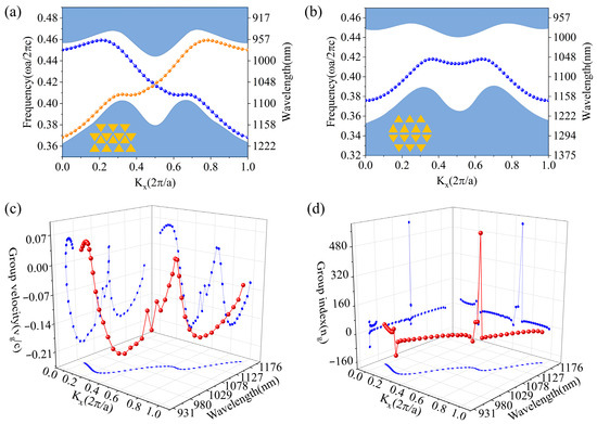 (a) Edge state plots (dotted lines) of the zigzag (a) and beard (b) type boundary structures (The shaded blue regions represent the bulk bands. The blue and orange dotted lines in (a) represent the two pseudospin states). Plots (red dotted lines) of normalized group velocity (vg/c) (c) and group refractive index (ng) (d) versus Kx (blue dotted lines) and wavelength (blue dotted lines) of the zigzag-type boundary.