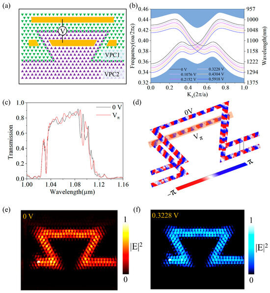 where s is the gap between electrodes, and there is a linear relationship between the applied voltage and the change in refractive index. As shown in Figure 3d, when a voltage (Vπ) is applied in the orange region, a π-phase modulation is generated. We set the voltage change to 0.0538 V (corresponding to the refractive index change of 0.0125) (the details of the design process are shown in Supplementary Materials Section S4). The edge-state curves at different voltages are shown in Figure 3b, and it can be seen that the working wavelength red-shifts as the voltage on the Ω-shaped waveguide is sequentially increased, because the effective refractive index increases with increasing applied voltage. Meanwhile, the forward transmittance spectrum and the electric field intensity distributions at Vπ remain similar to those at 0 V, as shown in Figure 3c,f confirm that phase-only modulation can be achieved. In addition, the phase distributions confirm the achievement of π phase modulation as shown in Figure 3d.