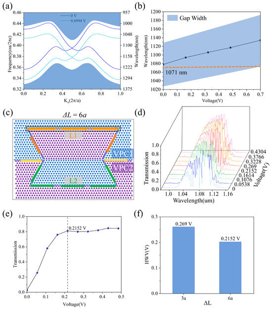 (a) Edge state curves under externally applied voltages of 0 V and 0.6994 V; (b) The tuning curve of the photonic bandgap range with voltage. (c) Schematic diagrams of the structure when the arm length difference ΔL = 6a. The blue and purple colors represent VPC1 and VPC2, respectively. The yellow arrows represent the entry and exit waveguides of the MZI structure. The orange and green colors represent the optical waveguides of the arms L1 and L2, respectively. (d) The transmission plots of the MZI EOM (ΔL = 6a) with different voltages at different wavelengths. (e) Localized magnification of the transmittance at 1075 nm. (f) The comparison bar chart of the HWV of ΔL = 3a and ΔL = 6a.