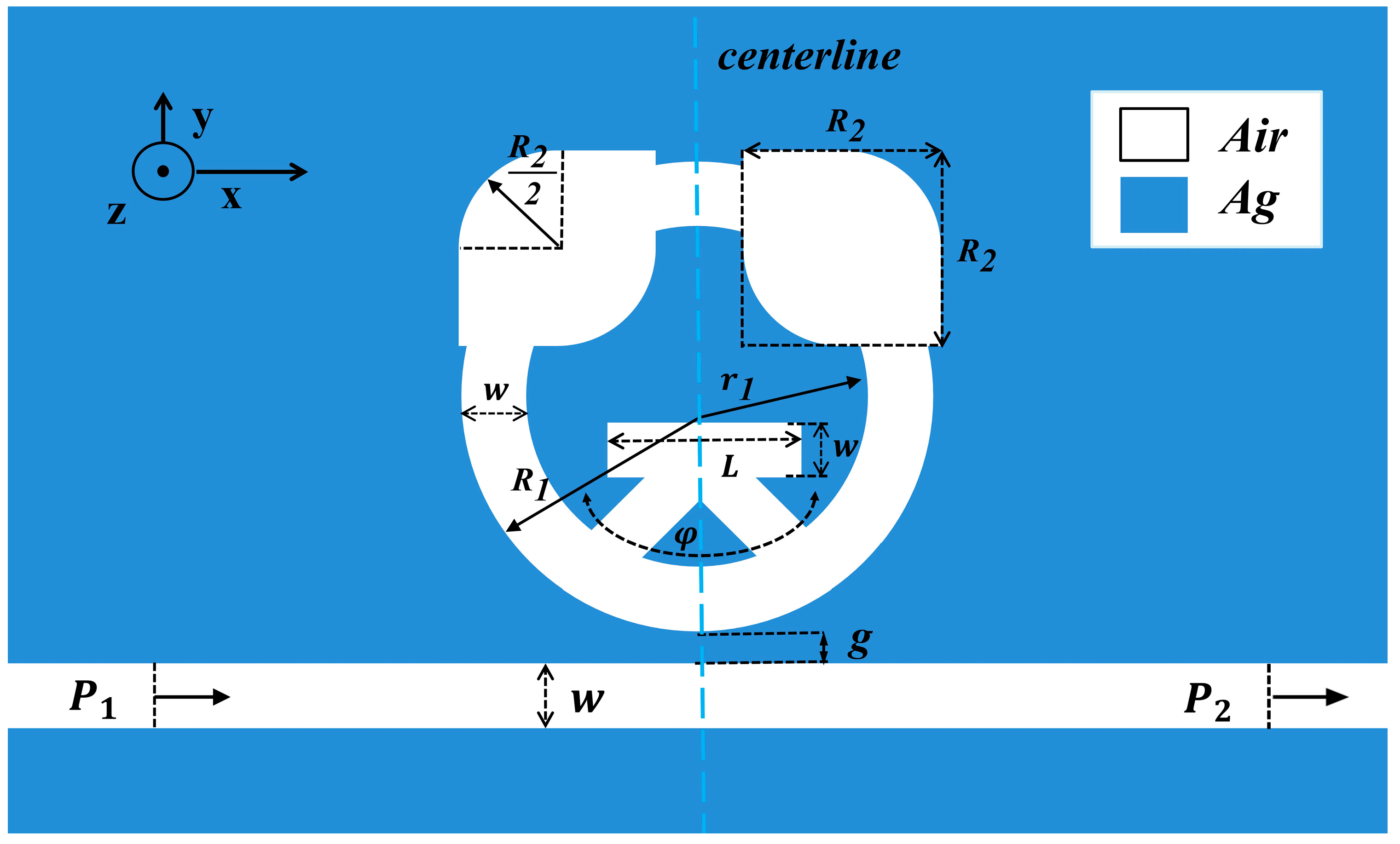 Figure 1, the blue areas represent silver (Ag), while the white zones indicate the dielectric medium. To investigate the fundamental sensing properties, air (relative permittivity = 1) is selected as the filling dielectric.