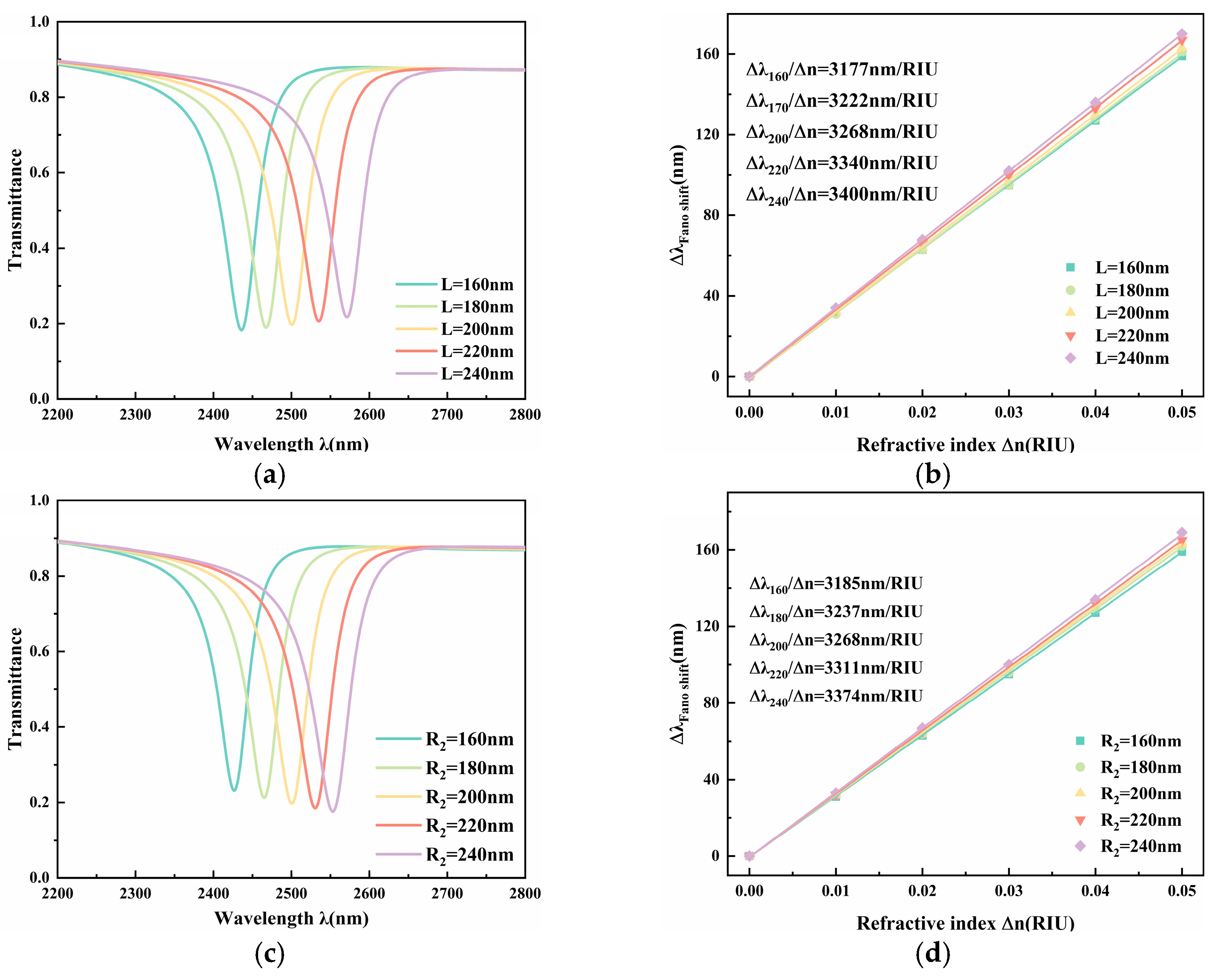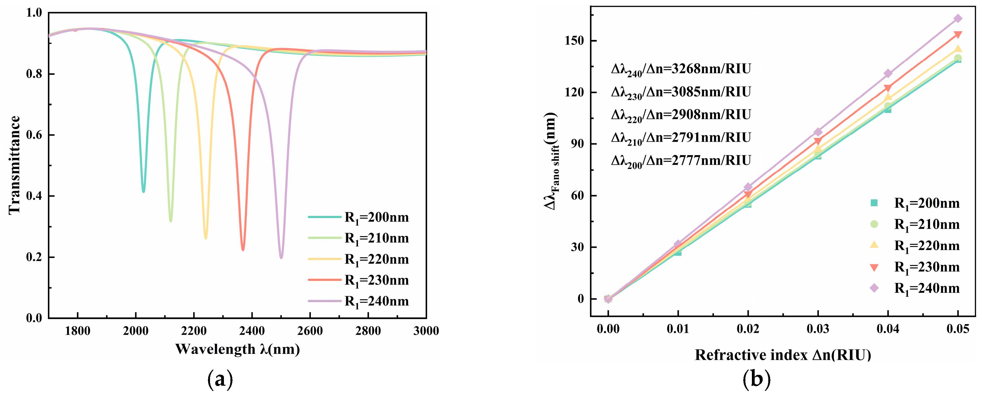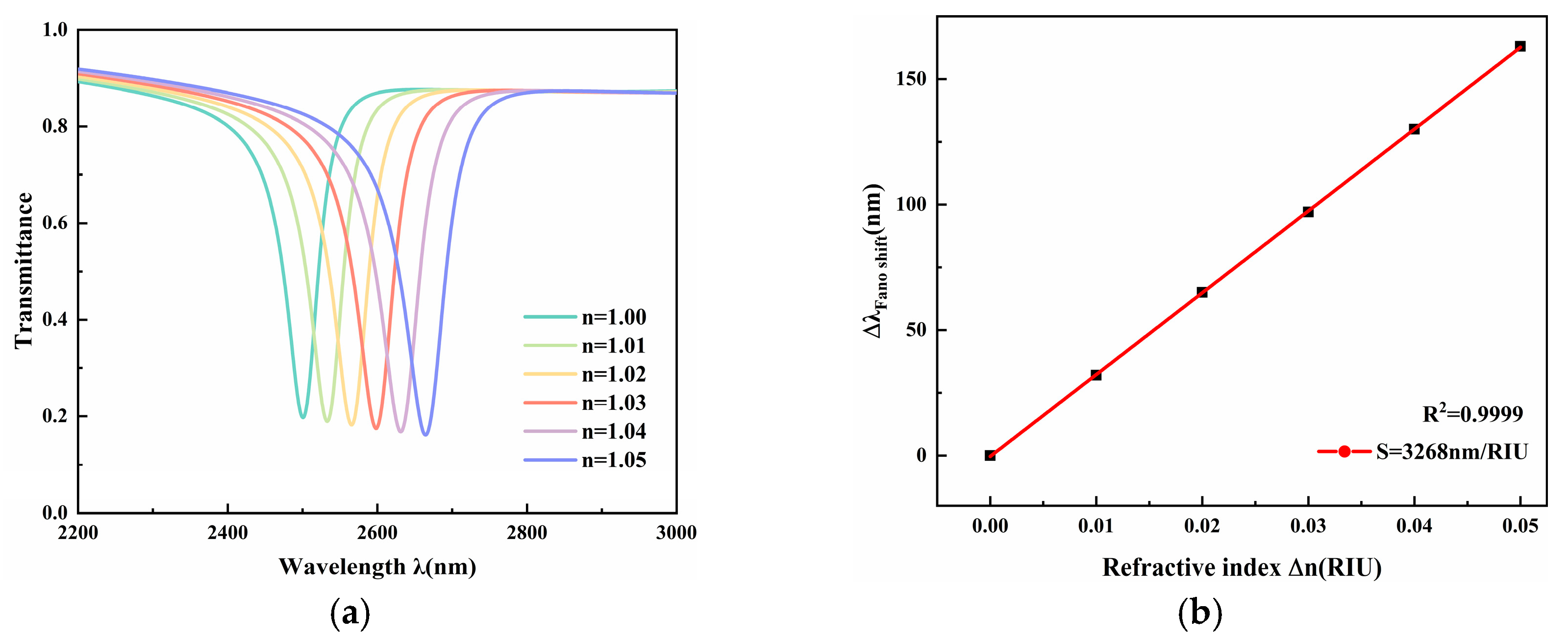 16]. Compared with symmetric Lorentzian resonances, the abrupt spectral variation at the Fano line edge is more sensitive to small perturbations in the ambient refractive index and can induce significant resonance wavelength shifts even for tiny refractive-index changes. Thus, Fano resonances provide an effective route for constructing high-precision refractive-index-sensitive structures.