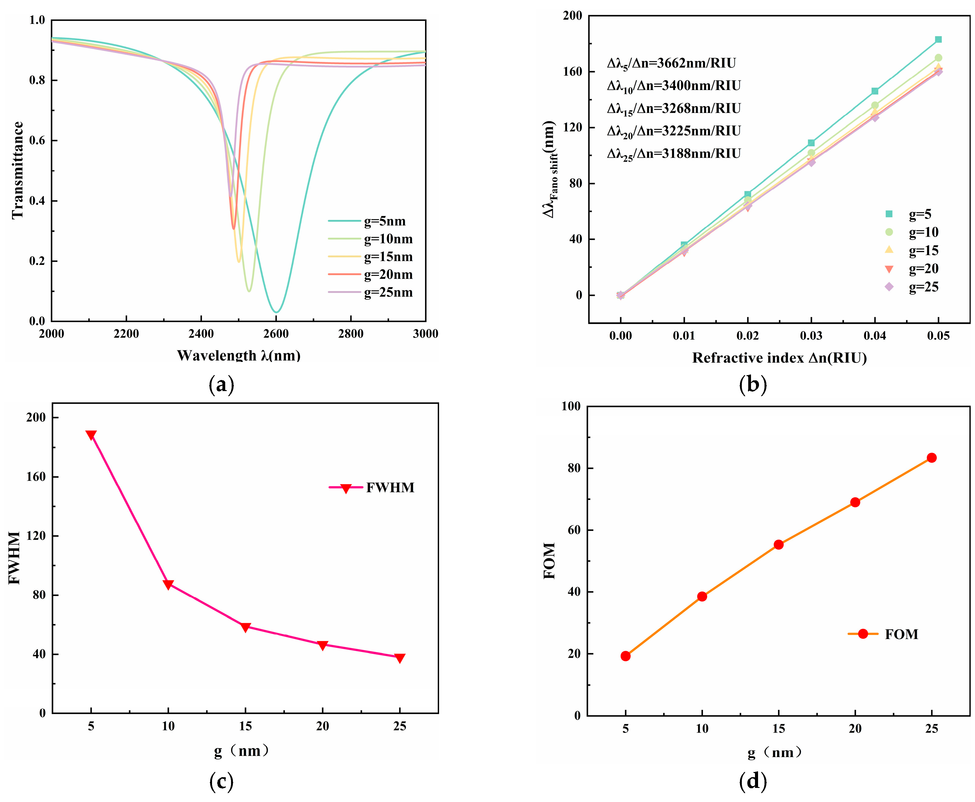 (a) Transmission spectra for different g; (b) Linear-fit lines of resonance wavelength versus refractive index for different g; (c) FWHM for different g; (d) FOM for different g.