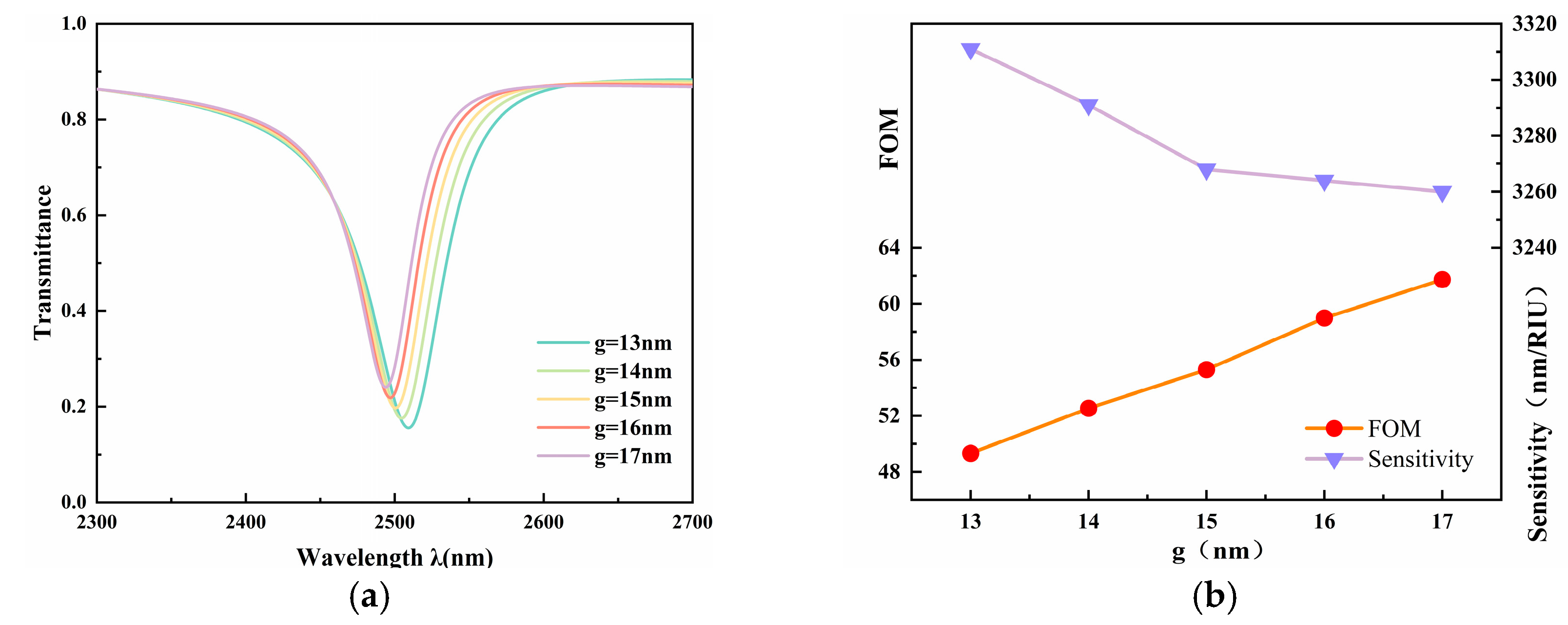 Tolerance Analysis: (a) Transmission spectra for different g (15 ± 2 nm); (b) FOM and S for different g (15 ± 2 nm).