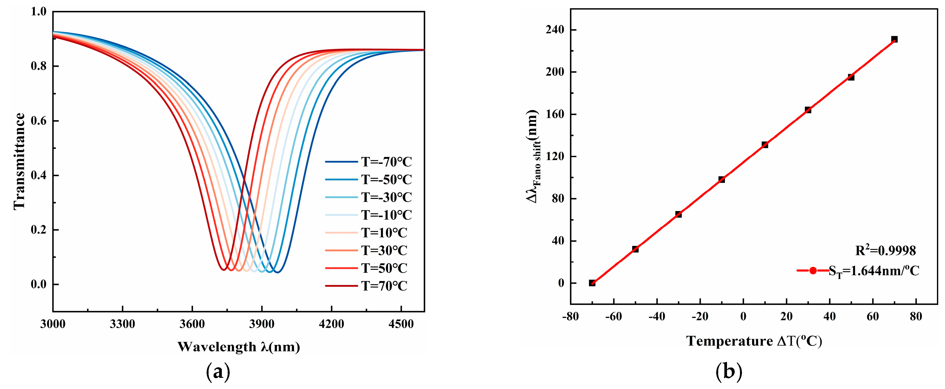 - Zhu, J.; Jin, G. Detecting the Temperature of Ethanol Based on Fano Resonance Spectra Obtained Using a Metal-Insulator-Metal Waveguide with SiO2 Branches. Opt. Mater. Express 2021, 11, 2787. [Google Scholar] [CrossRef]
