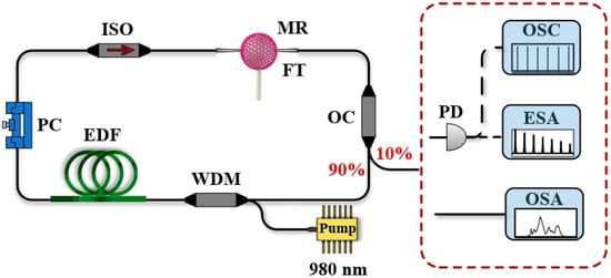 The configuration of the composite dual-cavity passive MLL based on TiO2/SiO2 FMR is shown in Figure 1. The laser employs a ring-cavity structure. A 980/1550 nm wavelength-division multiplexer (WDM) is used for pump coupling, and a 2.3 m single-mode erbium-doped fiber (EDF, Nufern, EDFL-980-HP, East Granby, CT, USA) serves as the gain medium. A polarization-independent isolator (ISO) is inserted to isolate the reflected light from the TiO2/SiO2 FMR and ensure the unidirectional propagation of the light. A polarization controller (PC) is inserted to adjust the intra-cavity polarization state. The 980 nm pump is provided by a laser diode. The TiO2/SiO2 FMR is incorporated into the main ring cavity via a fiber taper (FT), where it functions simultaneously as a nonlinear modulation element and a narrowband spectral filter. The output laser is extracted from the 10% port of the OC, and the 90% port is used as the cavity feedback to maintain the operation of the laser. The experimental results are measured by an oscilloscope (OSC, Agilent, DSO9254A, Santa Clara, CA, USA), an optical fiber coupling power meter (Thorlabs, S145C, Newton, MA, USA), a spectrum analyzer (OSA, Yokogawa, AQ6370D, Tokyo, Japan), and a radio frequency analyzer (ESA, Agilent, N9030A, Santa Clara, CA, USA).