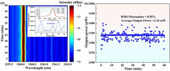 To evaluate the long-term stability of the mode-locking state, the output spectrum and the power of the MLL are continuously monitored at the pump power of 105.7 mW, as shown in Figure 5.