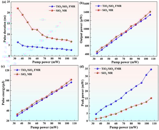 As shown in Figure 6a, the pulse duration gradually decreases with increasing pump power. Comparative results indicate that the narrowest pulse duration obtained with the TiO2/SiO2 FMR is 2.8 ns, representing a 57% reduction relative to 6.6 ns achieved with the SiO2 MR. Figure 6b,c show that both the average output power and single-pulse energy increase linearly with pump power. At the pump power of 105.7 mW, the output power and single-pulse energy of the SiO2 MR reach 1.41 mW and 101.6 pJ, respectively, which are slightly higher than those of the TiO2/SiO2 FMR (1.34 mW and 96.3 pJ). Figure 6d shows that the peak power increased with pump power, and the TiO2/SiO2 FMR achieved a maximum peak power of 34.6 mW, representing a 126% enhancement relative to 15.3 mW for the SiO2 MR.