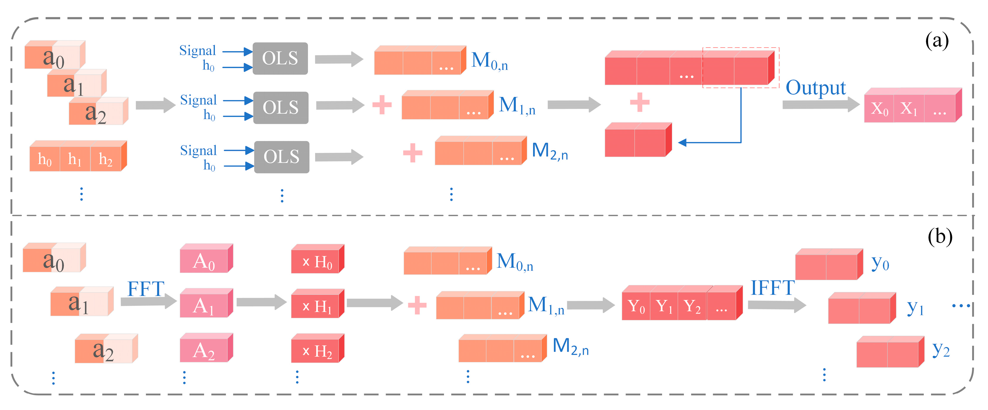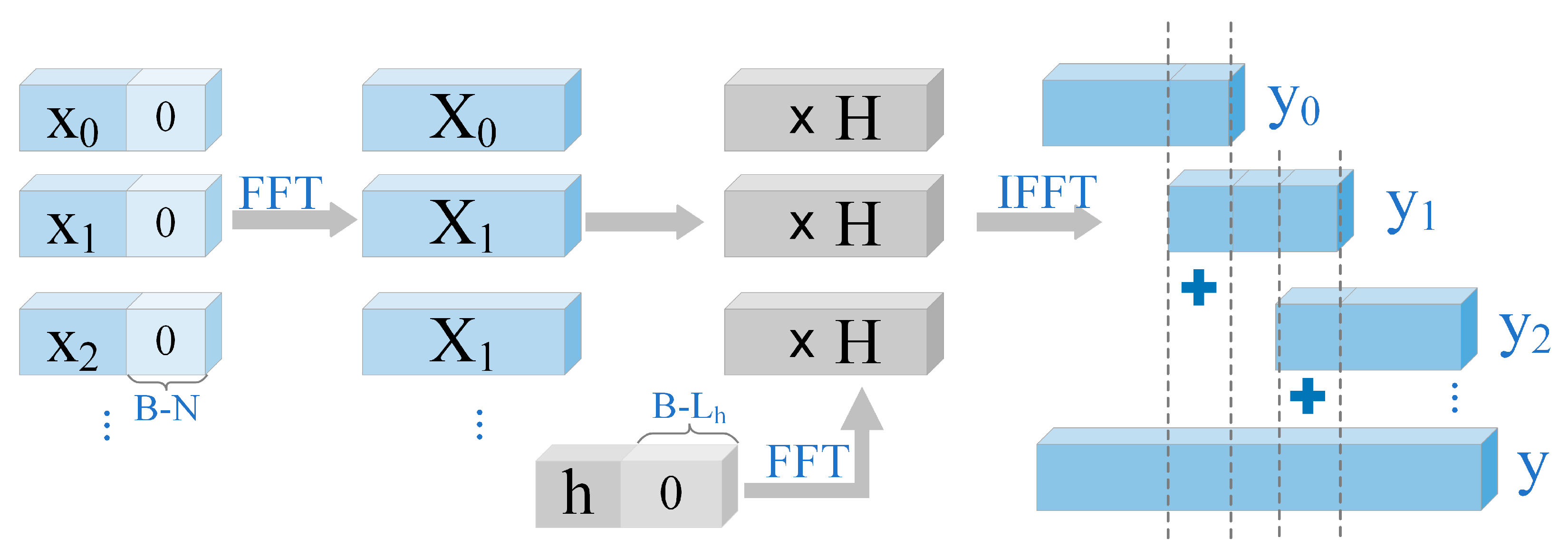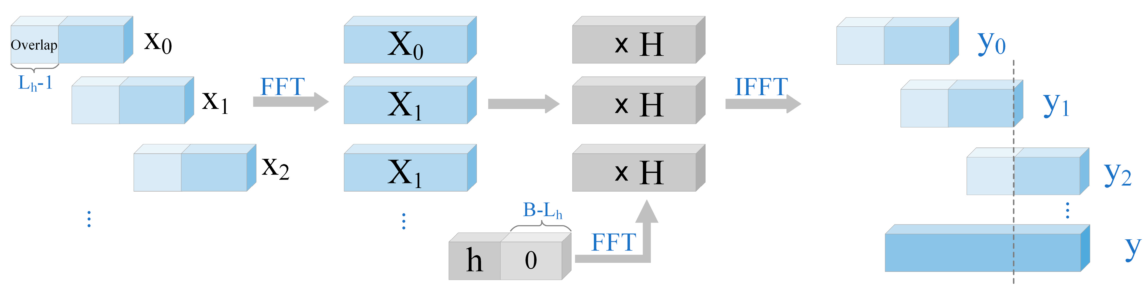 | OLS | Block convolution with overlapping segments; discards aliasing samples | Block length, overlap size, filter length | Requires per-block FFT + IFFT |