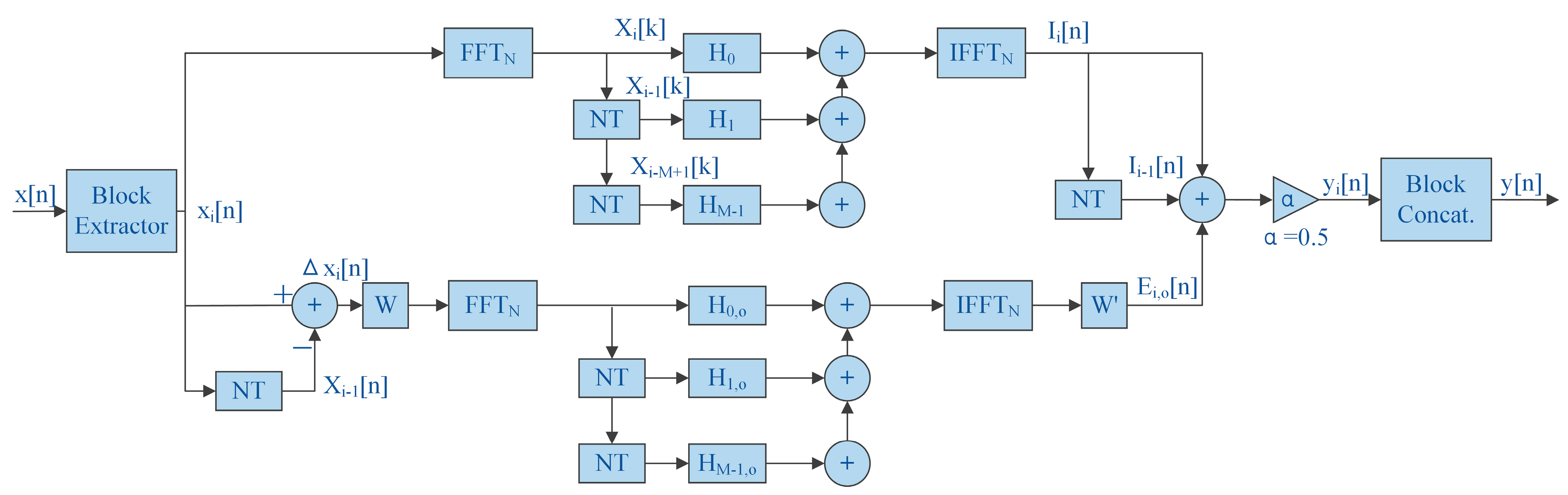 | TS-OLF | Non-overlapping blocks; error compensation via odd/even frequency decomposition | FFT length, total filter length | 4 FFT/IFFT per block; additional diagonal matrix multiplications; |