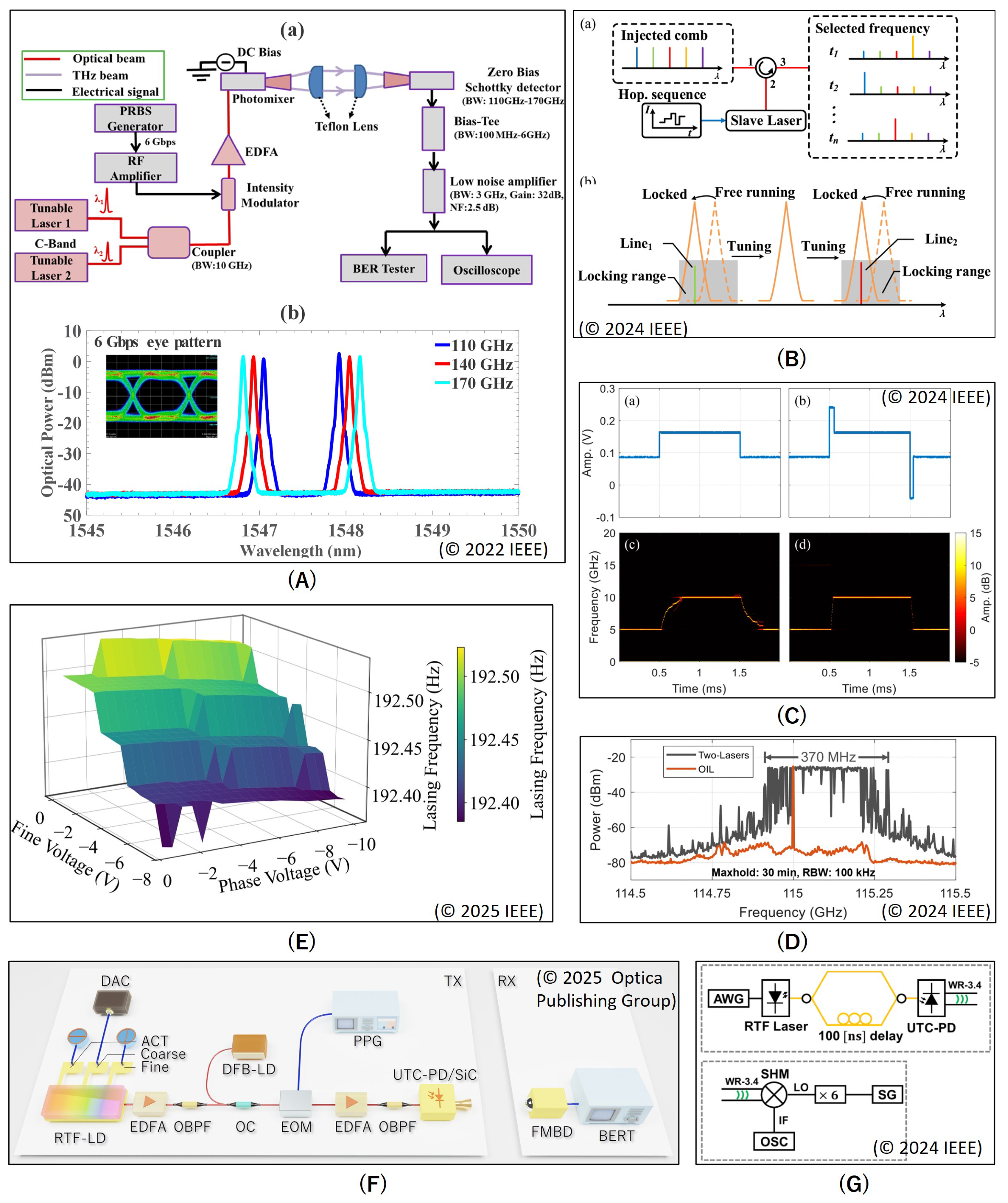 - Yang, Z.; Yang, F.; Zhang, J. Photonic-assisted THz Wideband Frequency Hopping and Secure Communication Based on Optical Injection Locking. In Proceedings of the CLEO: Science and Innovations, Charlotte, NC, USA, 5–10 May 2024; p. JTu2A–68. [Google Scholar]