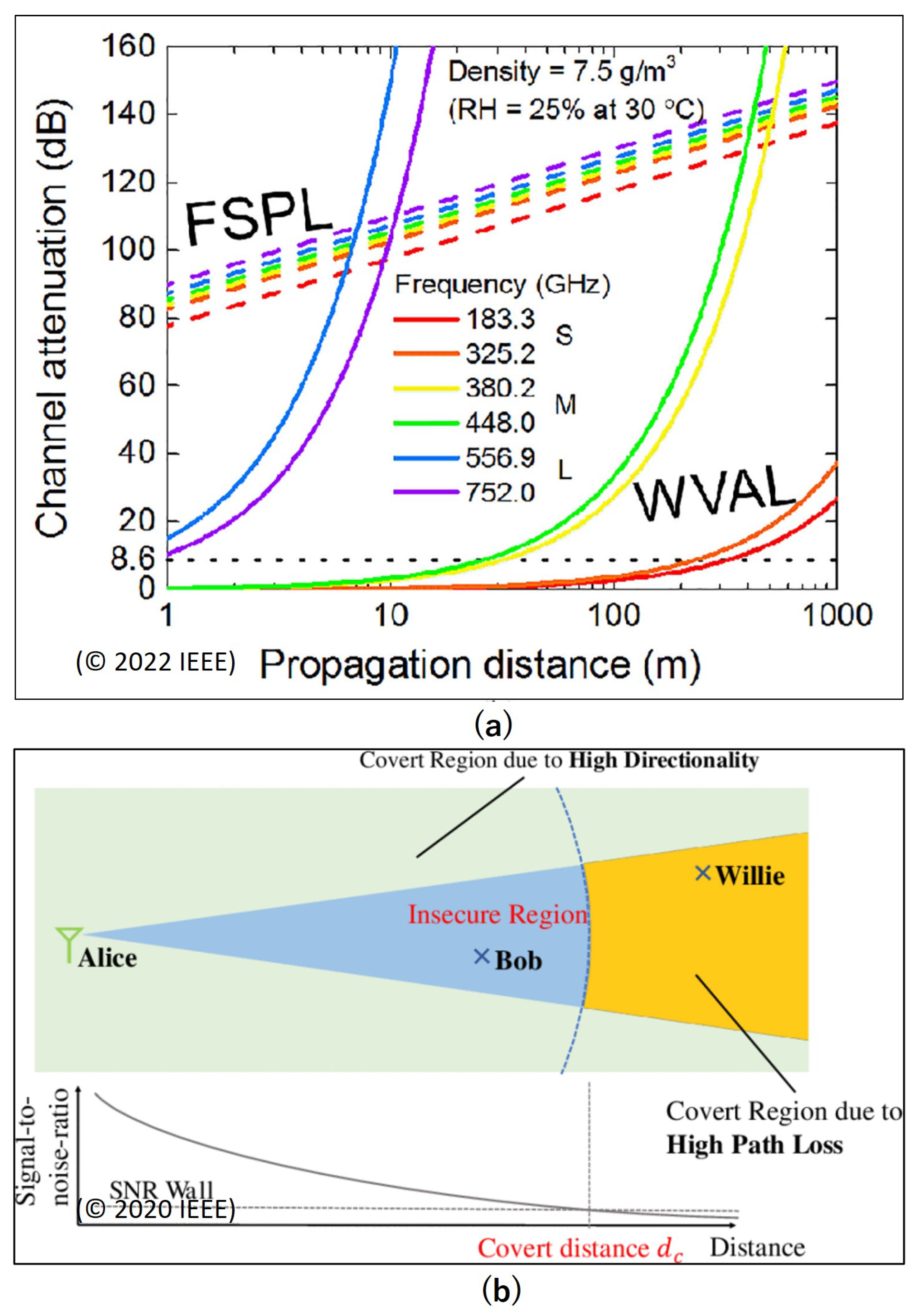 - Cohen, A.; D’Oliveira, R.G.; Yeh, C.Y.; Guerboukha, H.; Shrestha, R.; Fang, Z.; Knightly, E.W.; Médard, M.; Mittleman, D.M. Absolute security in terahertz wireless links. IEEE J. Sel. Top. Signal Process. 2023, 17, 819–833. [Google Scholar] [CrossRef]