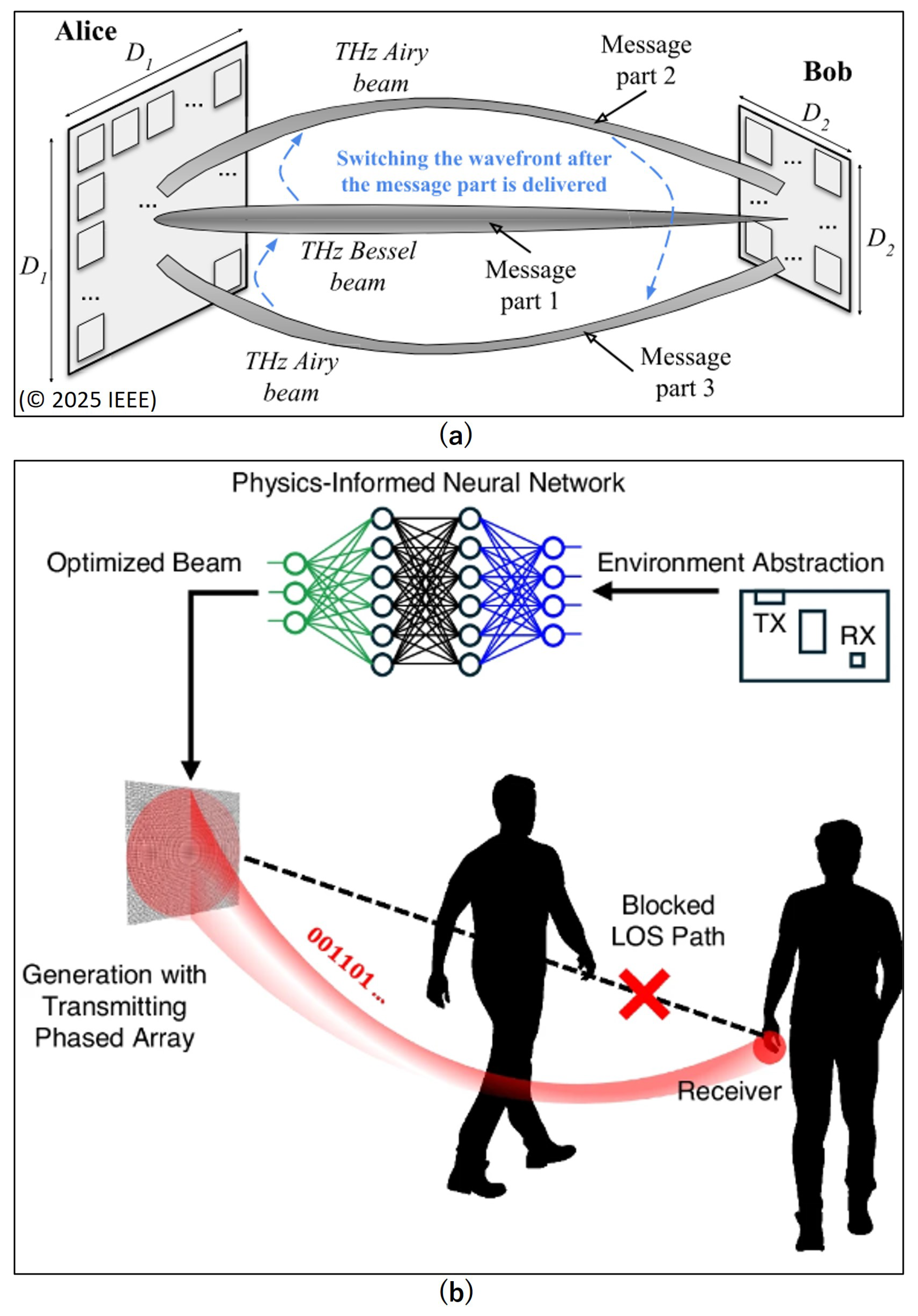 - Chen, H.; Kludze, A.; Ghasempour, Y. A physics-informed Airy beam learning framework for blockage avoidance in sub-terahertz wireless networks. Nat. Commun. 2025, 16, 7387. [Google Scholar] [CrossRef] [PubMed]