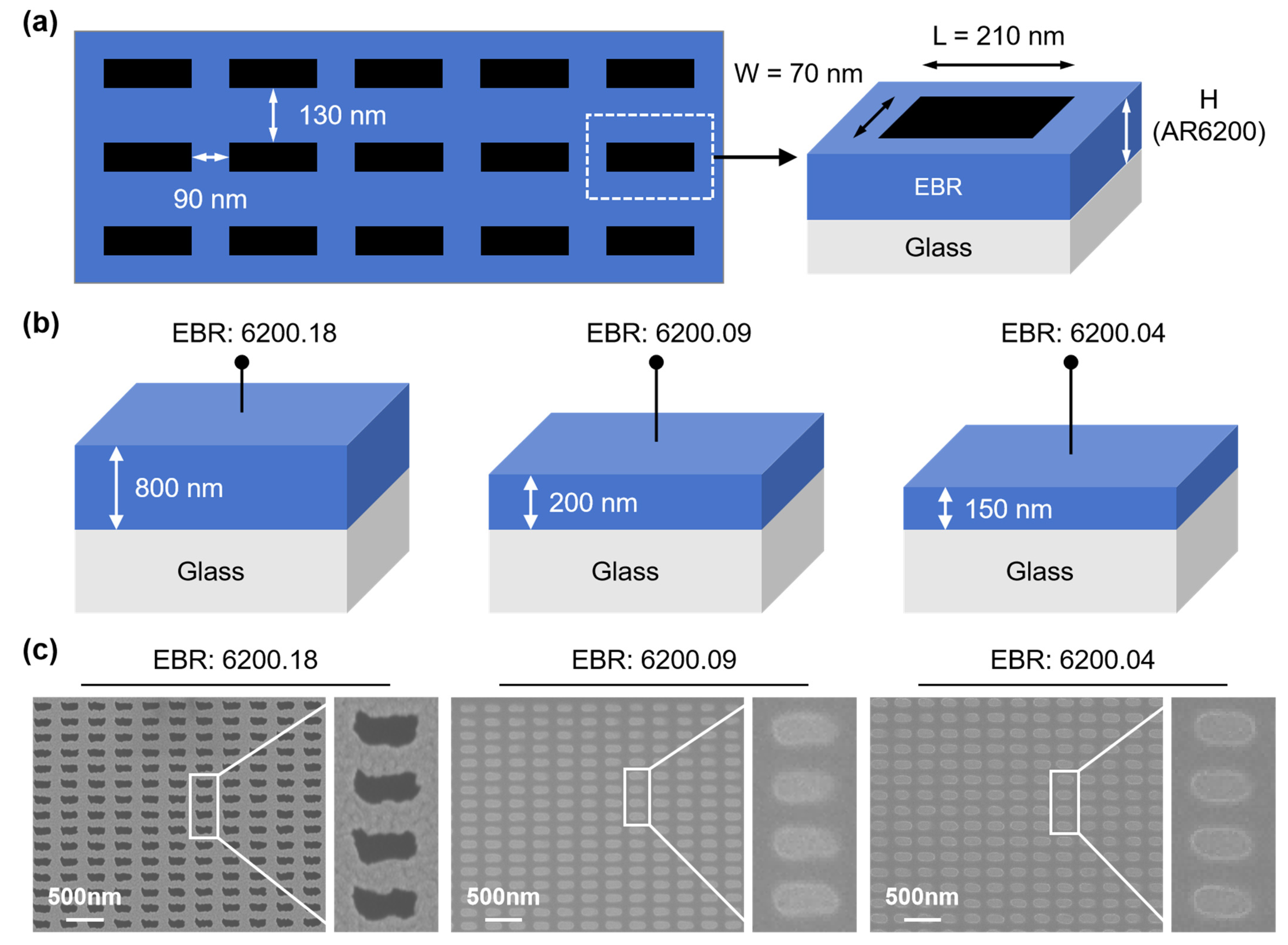 To evaluate the influence of EBR thickness on patterning fidelity in EBL, a single EBR series was spin-coated onto glass substrates to achieve three distinct thicknesses: 800 nm (6200.18), 200 nm (6200.09), and 150 nm (6200.04). We designed a rectangular array pattern for exposure, with each unit measuring 210 nm × 70 nm and arranged with a pitch of 300 nm horizontally and 200 nm vertically (
