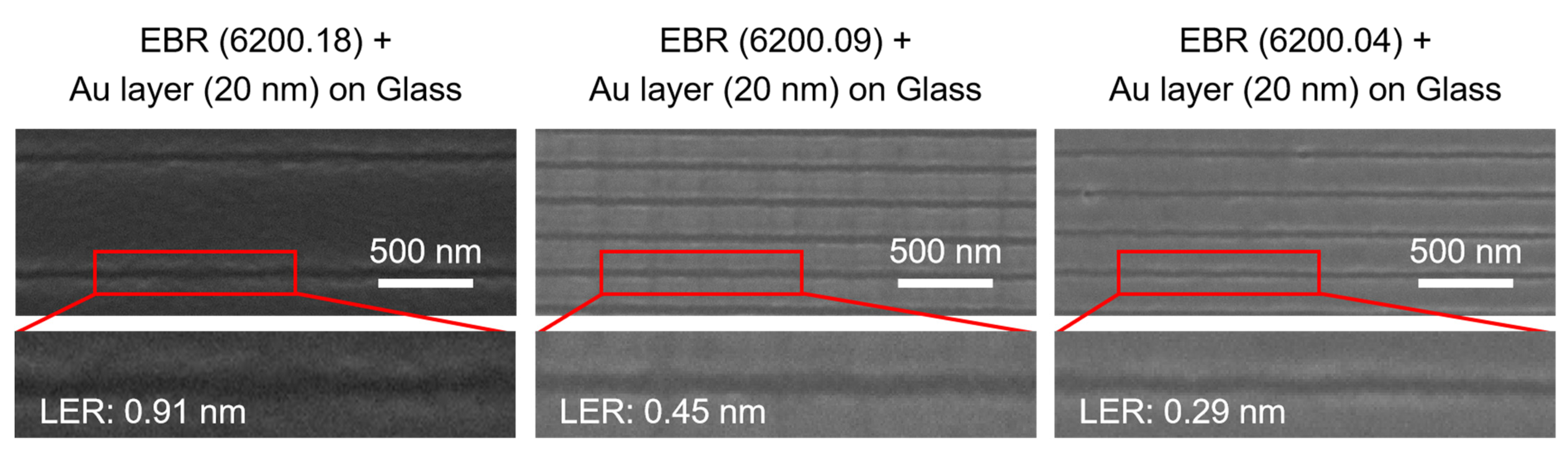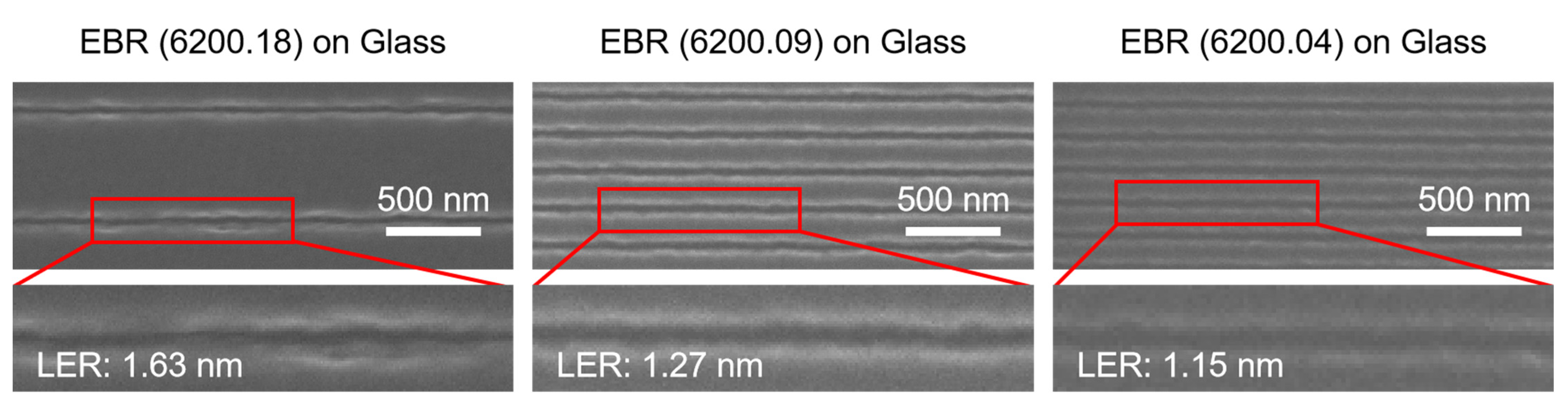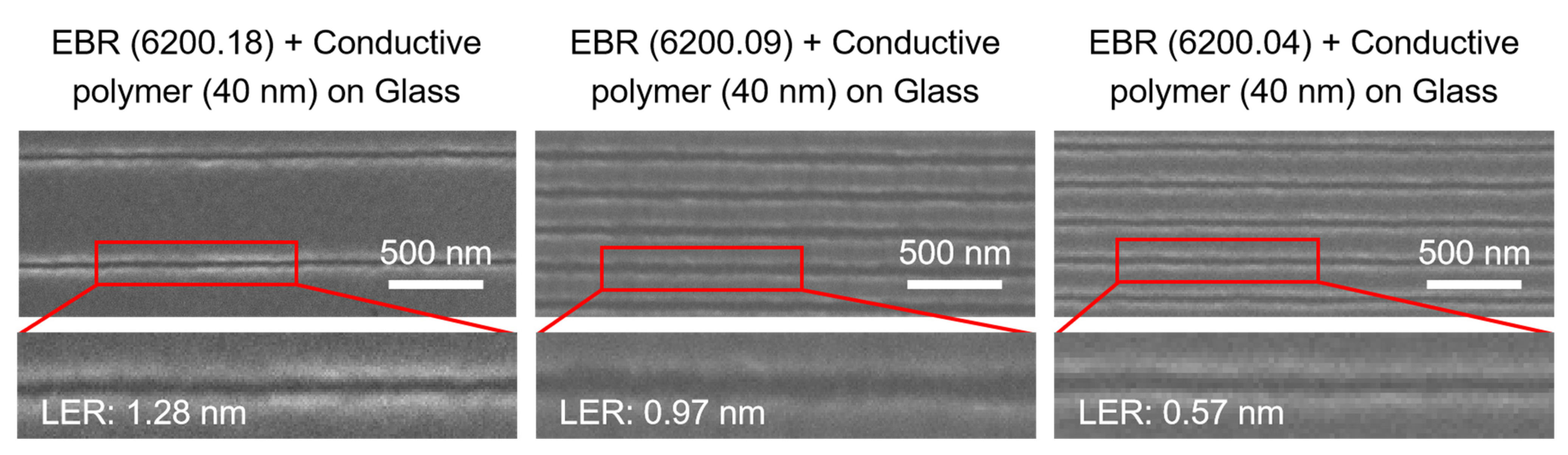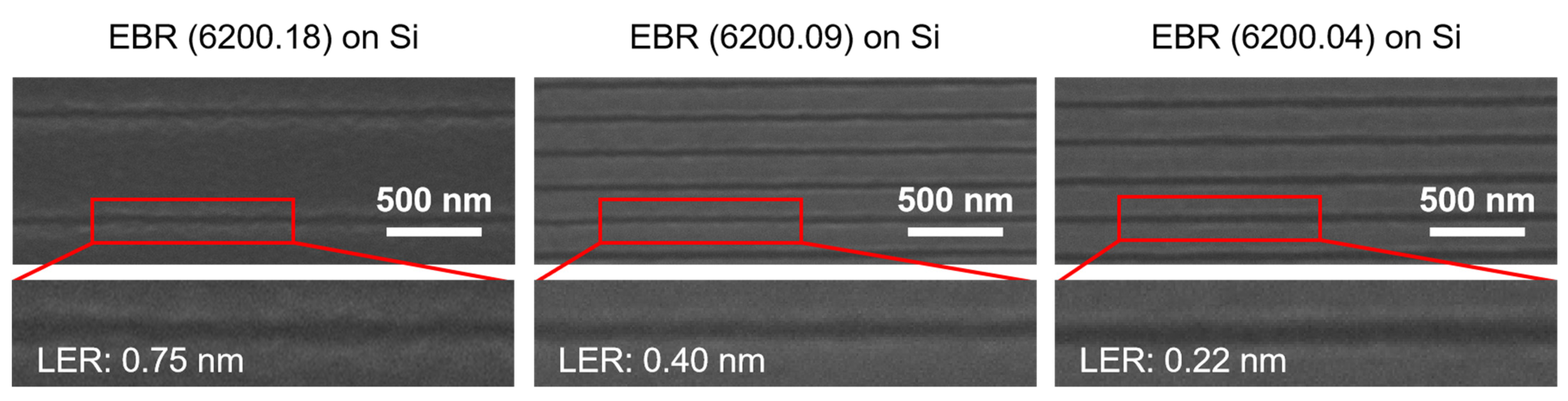 To benchmark the effectiveness of the charging mitigation strategies, a comparative experiment was conducted by spin-coating three types of EBR onto semiconductive silicon substrates. LER was measured on the same linear grating patterns (70 nm lines on 200 nm and 600 nm periods). The results, presented alongside SEM images in