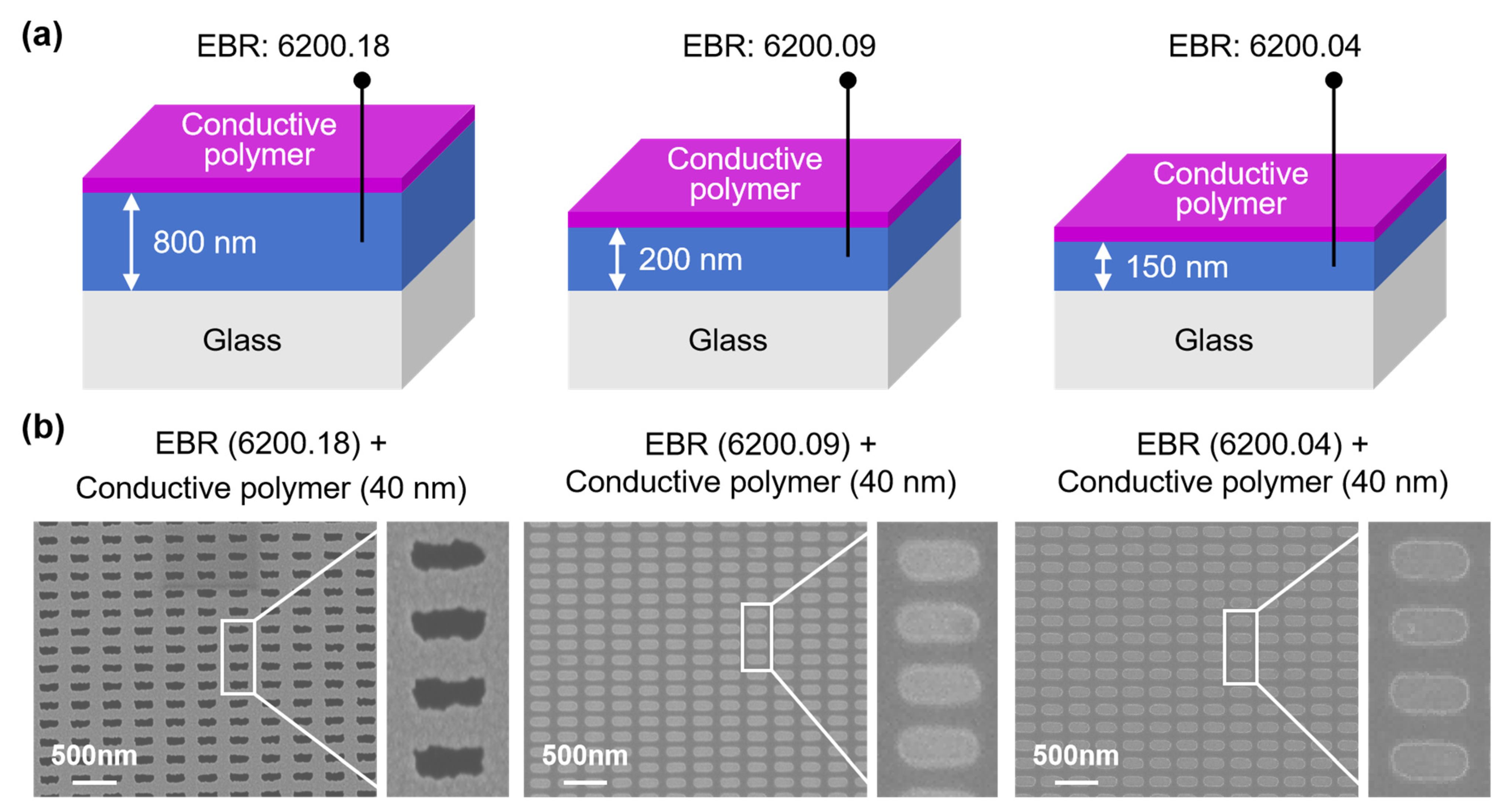 34]. The same conductive polymer was spin-coated onto each of the three EBR thicknesses (800 nm, 200 nm, and 150 nm), after which electron-beam exposure was carried out at 20 kV on glass substrates. To ensure reliable characterization and minimize artifacts from under-exposure, samples exhibiting well-defined morphology and sufficient exposure dose were selected for each resist thickness.