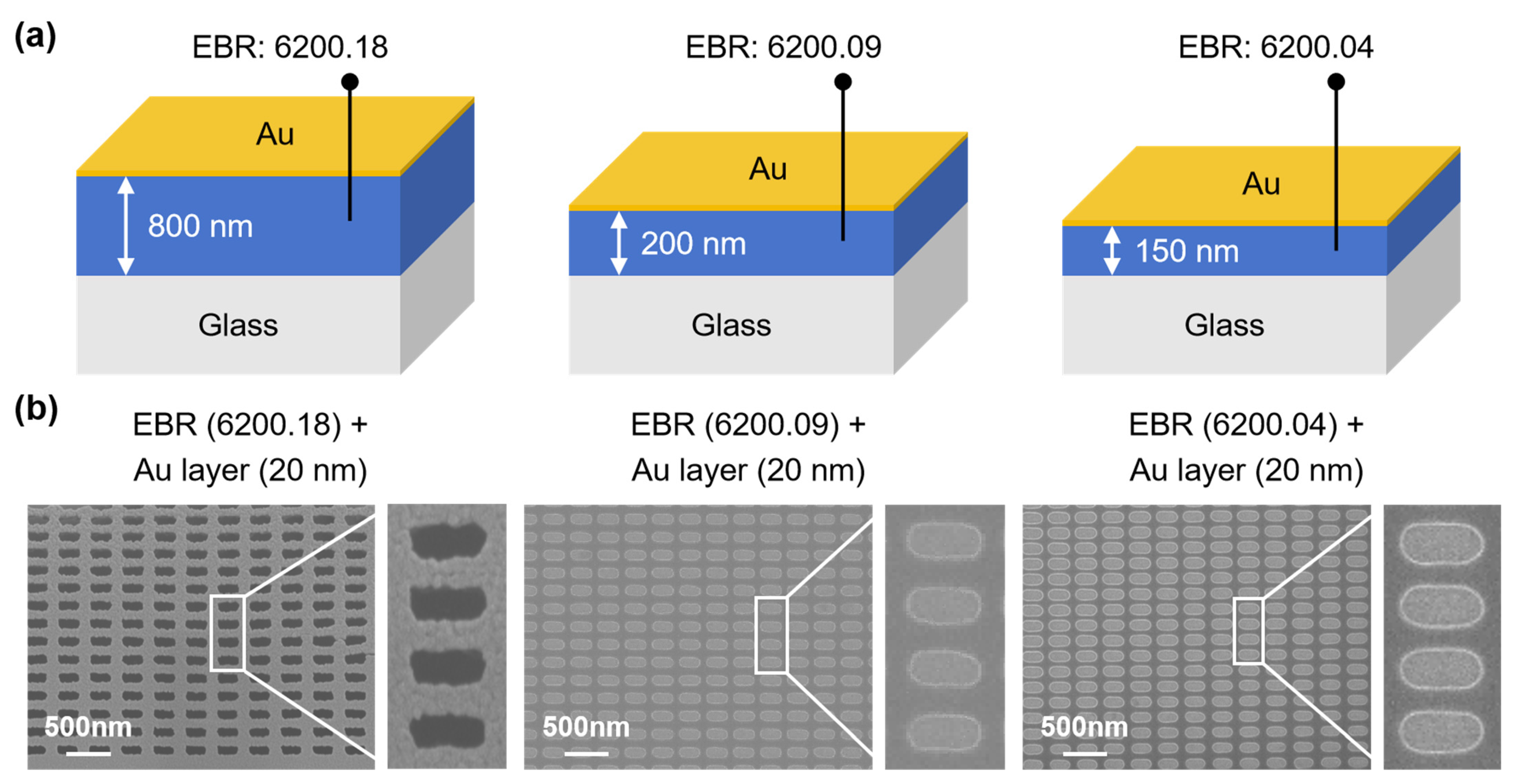 Figure 5b presents SEM images of the resulting nanostructures, fabricated by sequentially depositing the Au layer, performing EBL exposure, removing the metal via wet etching, and developing under optimized conditions. Structures fabricated with the 800 nm resist and the Au layer formed essentially complete rectangles with only minor edge irregularities. Both the 200 nm and 150 nm resists produced structures with sharp edges, high structural completeness, and minimal deformation, representing a significant advancement in patterning quality on glass substrates.