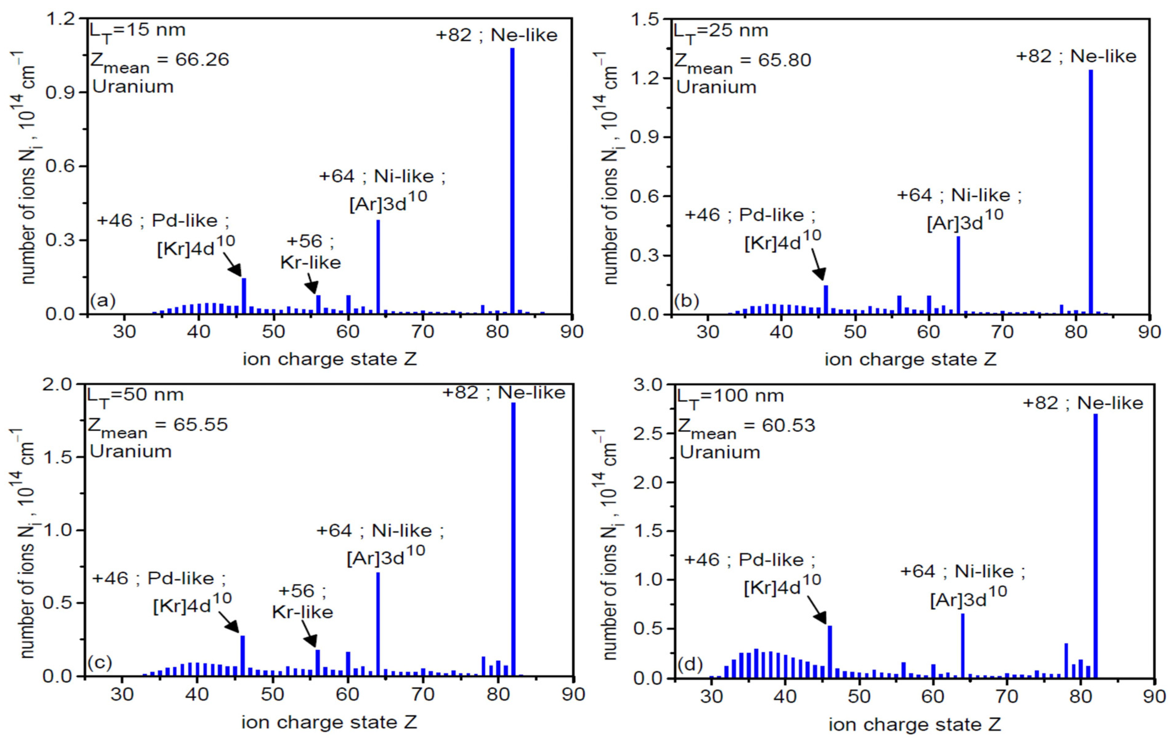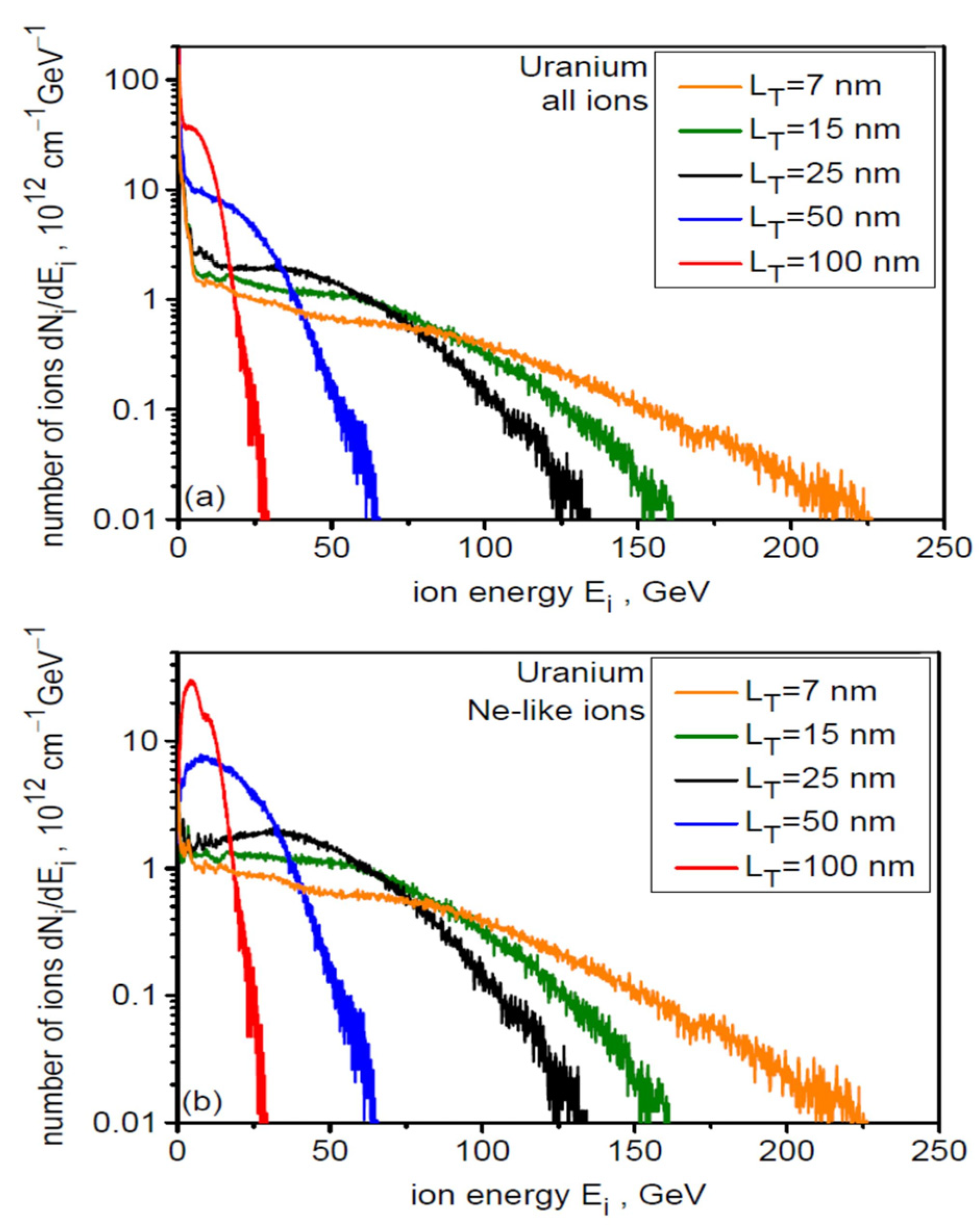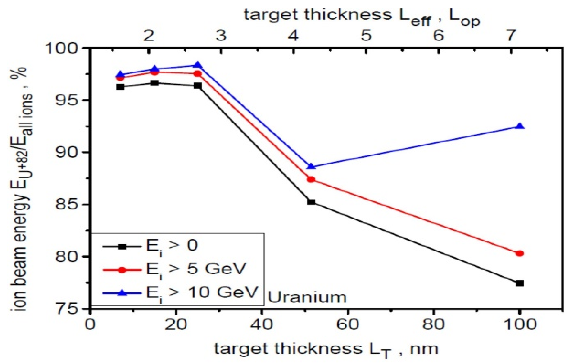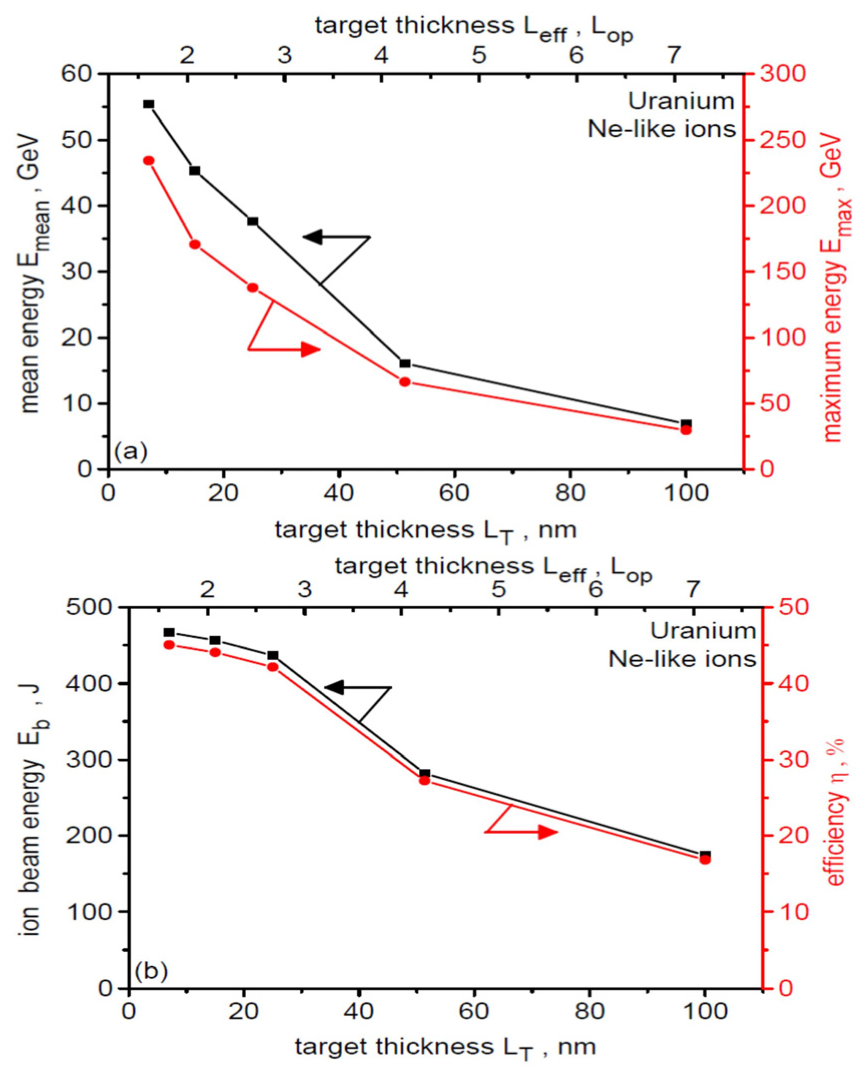 - Reducing the uranium target thickness LT at fixed laser pulse parameters leads to an increase in (a) mean and maximum ion energy, (b) beam intensity, (c) energetic acceleration efficiency, and (d) the percentage of Ne-like ions in the beam (the beam becomes more mono-charged), as well as to shortening the ion pulse duration. Simultaneously, reducing the target thickness results in an increase in the beam’s angular divergence and a reduction in ion fluence (the number of ions per unit area). Changes in these beam parameters with changes in target thickness are relatively rapid, which allows for control of these parameters by varying the target thickness.