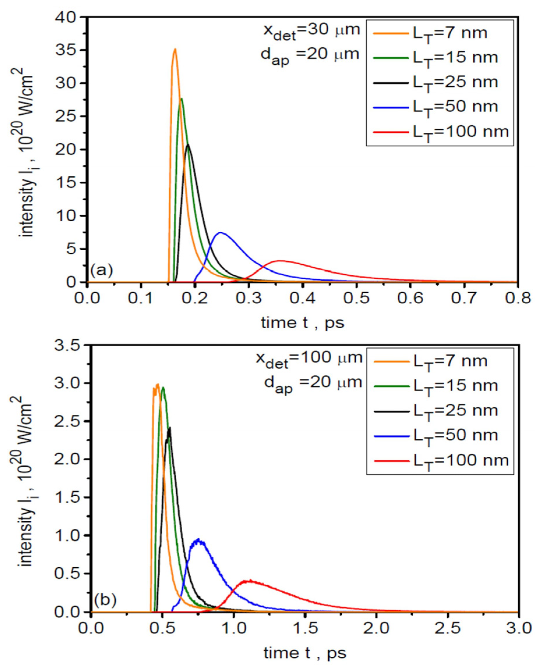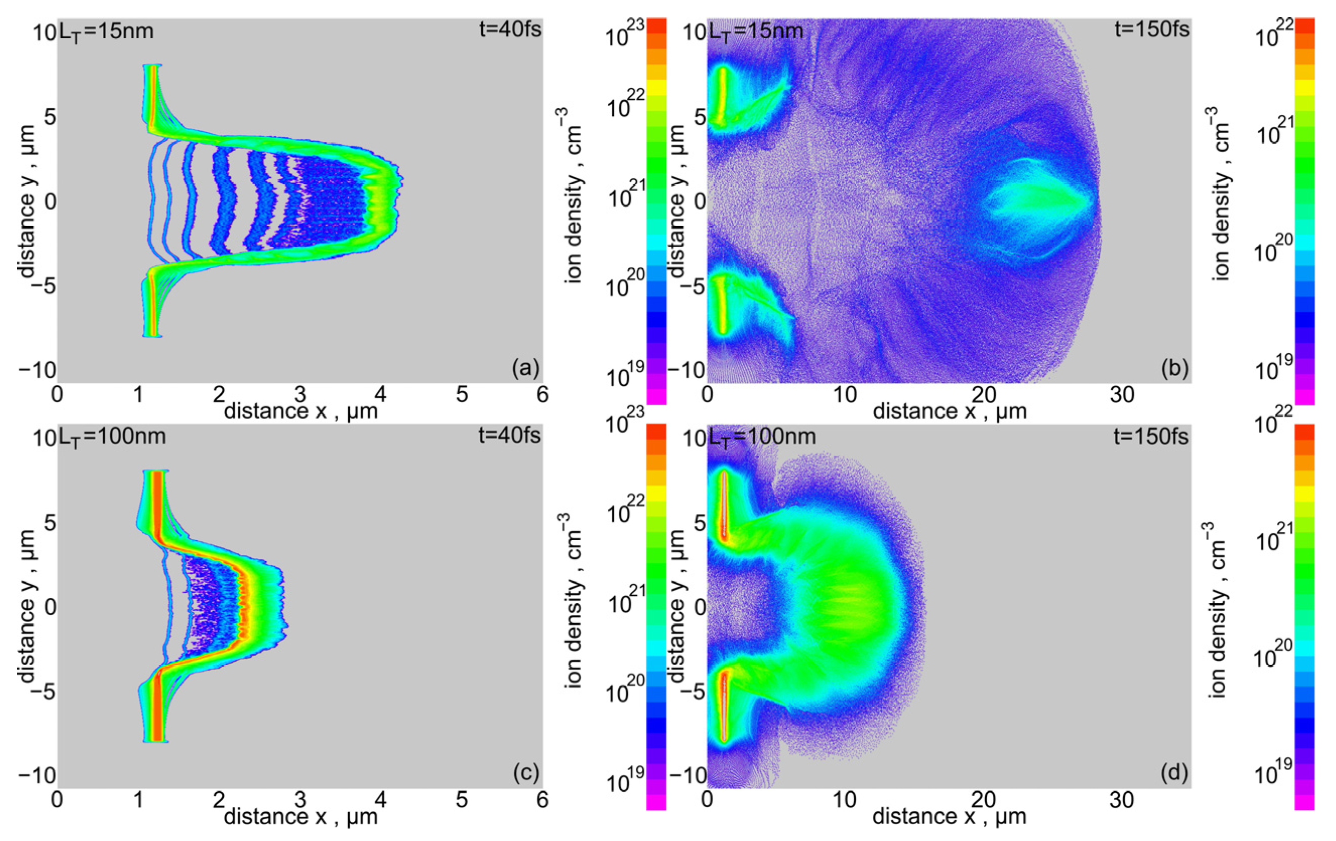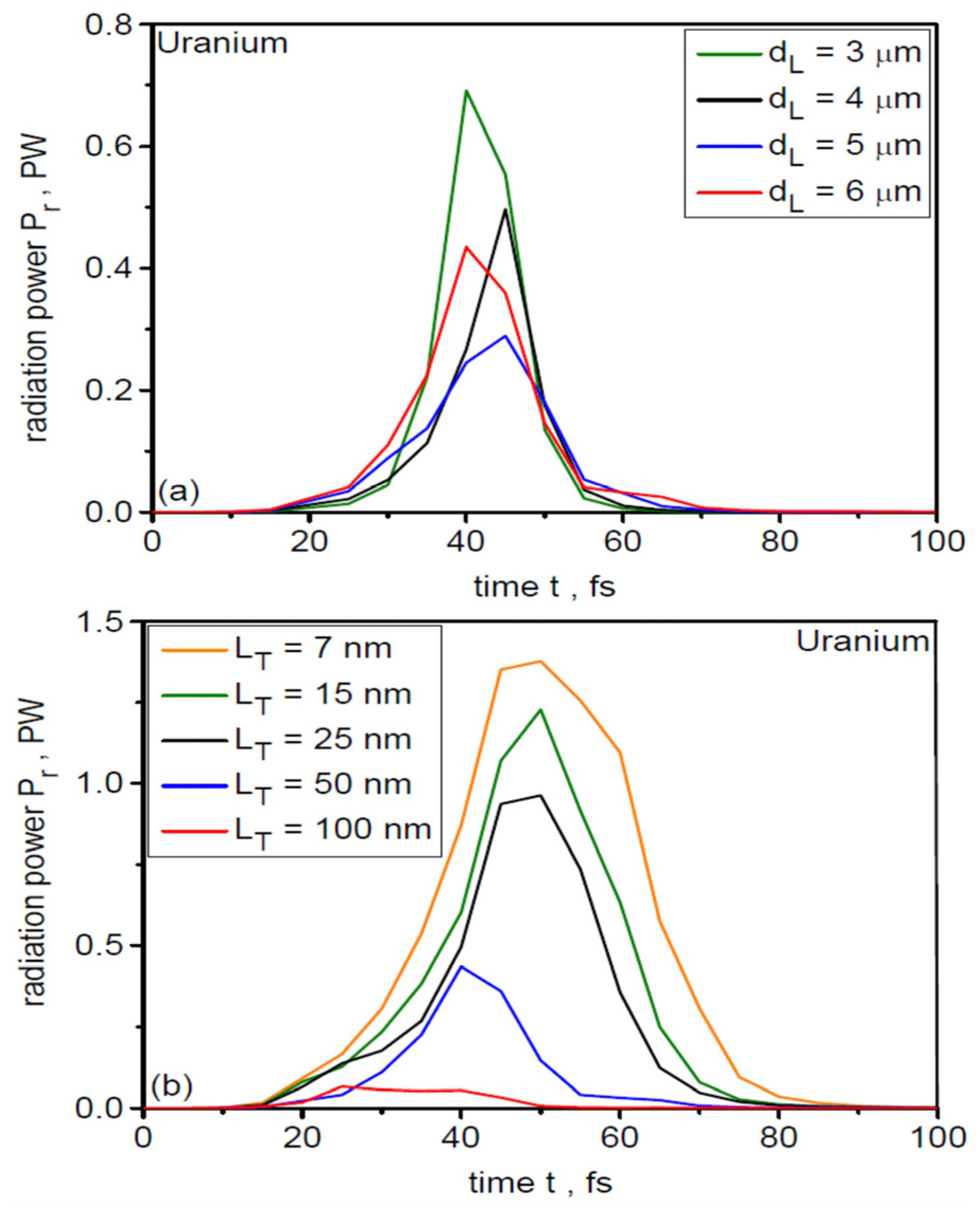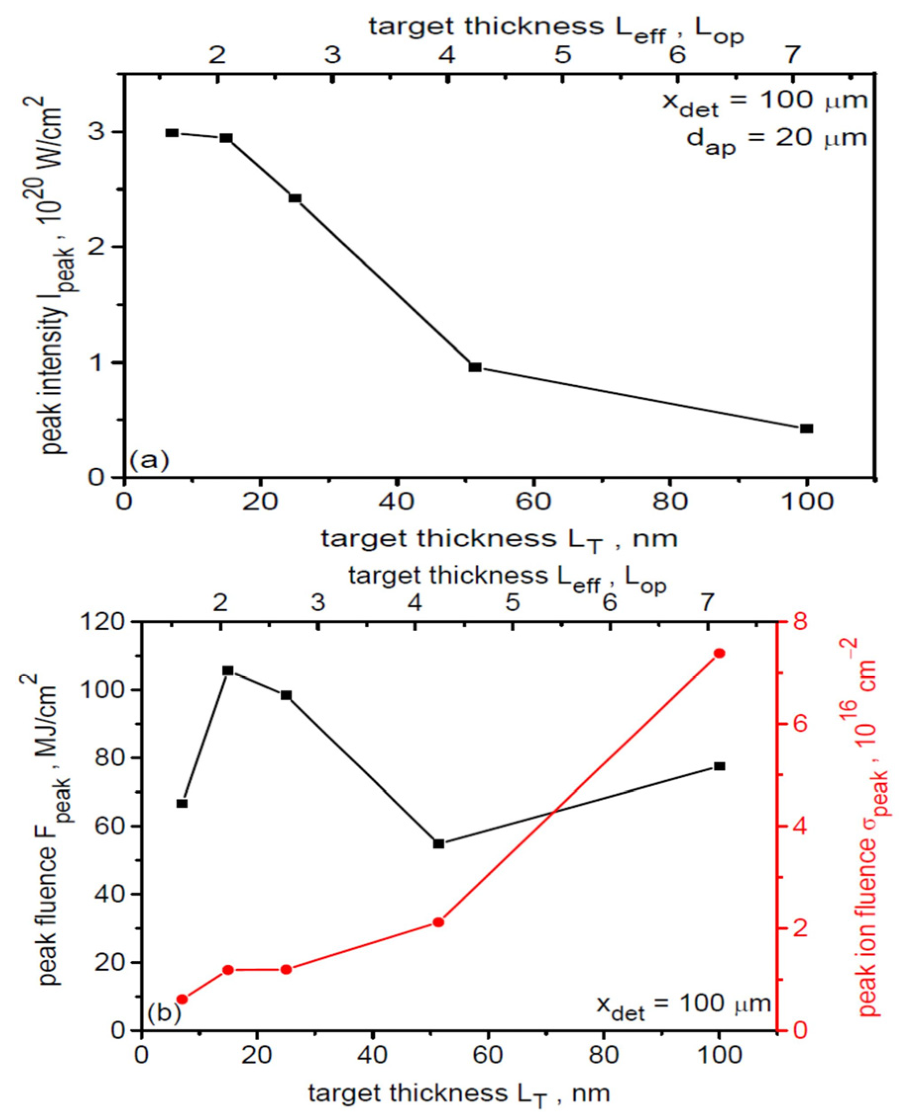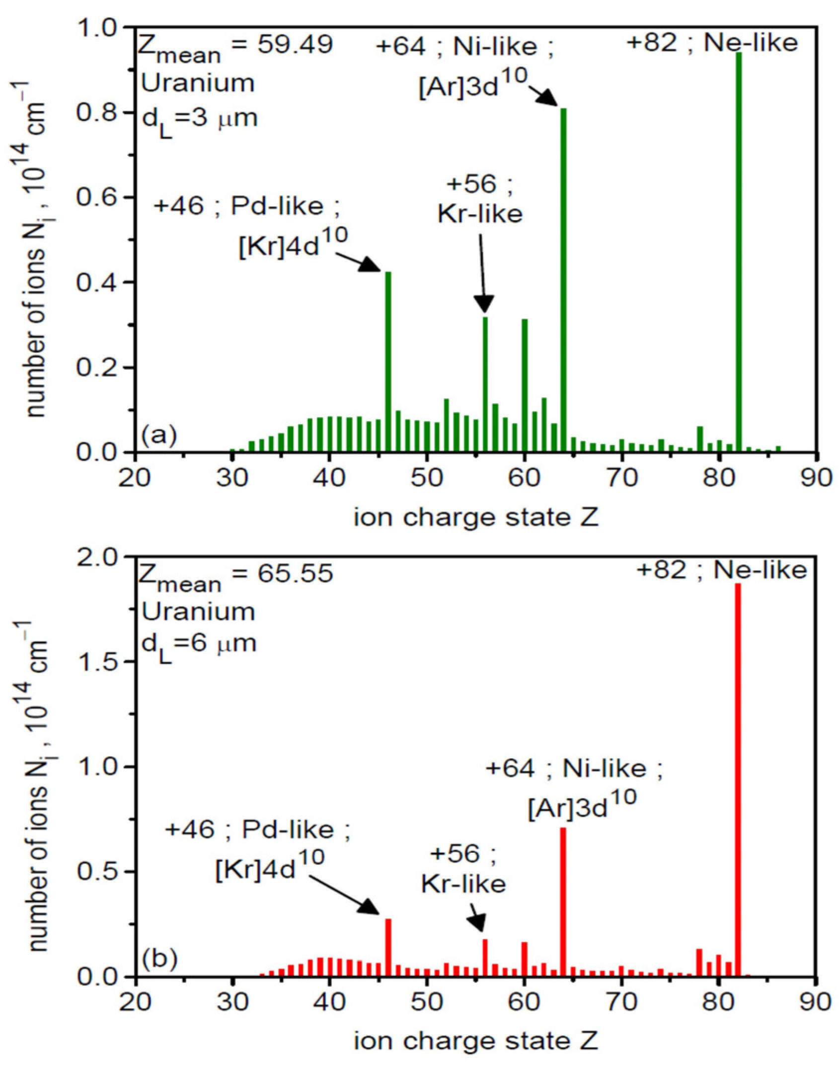 - Reducing the uranium target thickness LT at fixed laser pulse parameters leads to an increase in (a) mean and maximum ion energy, (b) beam intensity, (c) energetic acceleration efficiency, and (d) the percentage of Ne-like ions in the beam (the beam becomes more mono-charged), as well as to shortening the ion pulse duration. Simultaneously, reducing the target thickness results in an increase in the beam’s angular divergence and a reduction in ion fluence (the number of ions per unit area). Changes in these beam parameters with changes in target thickness are relatively rapid, which allows for control of these parameters by varying the target thickness.