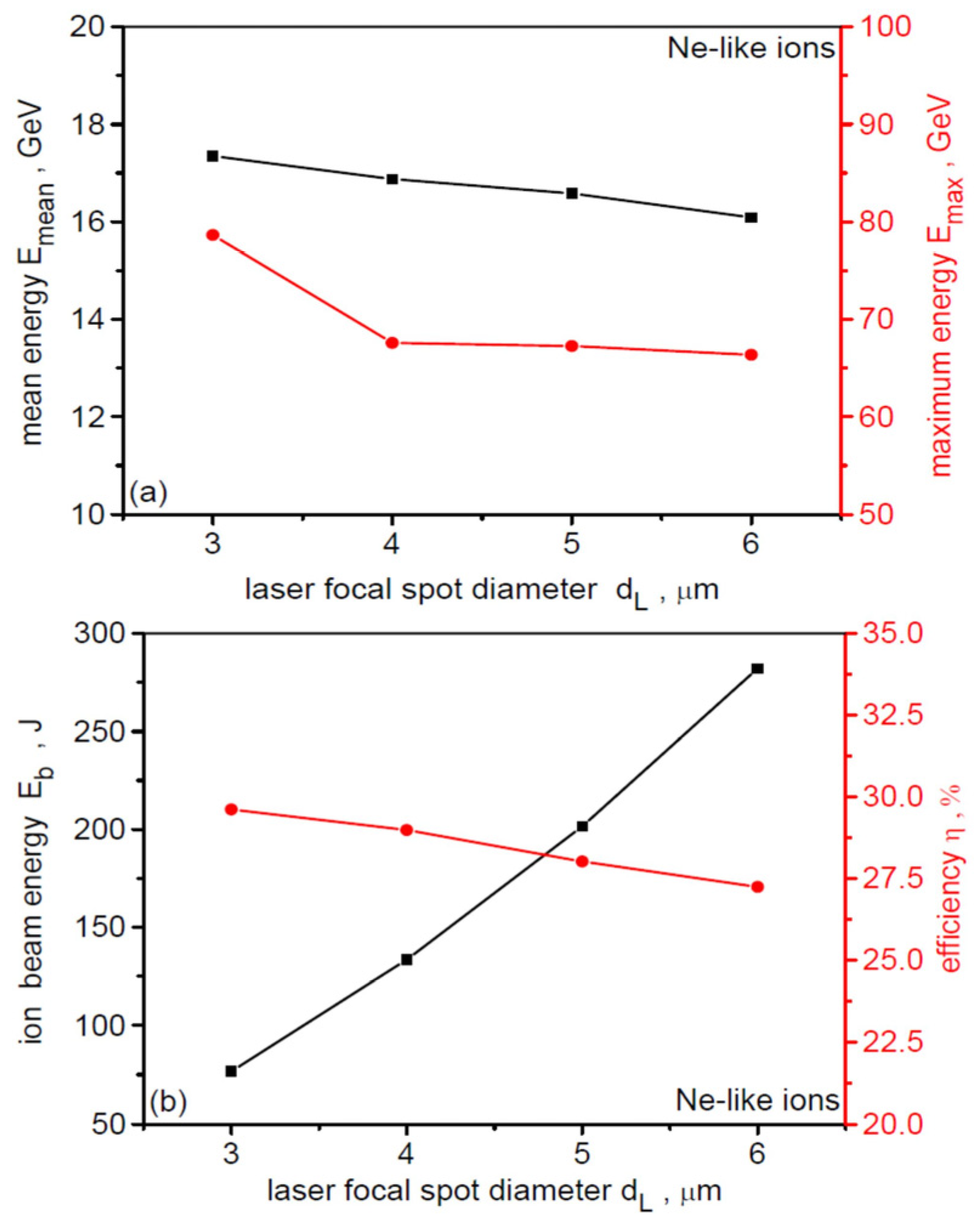 - Changing the laser focal spot size dL at a fixed laser intensity and target thickness leads to rather small changes in the mean and maximum energy of uranium ions and the laser-to-ion energy conversion efficiency. On the other hand, the dL variation results in very rapid changes in the peak intensity and peak fluence of the ion beam; however, these changes are mainly caused by the increase in laser energy accompanying the increase in the laser focal spot size.