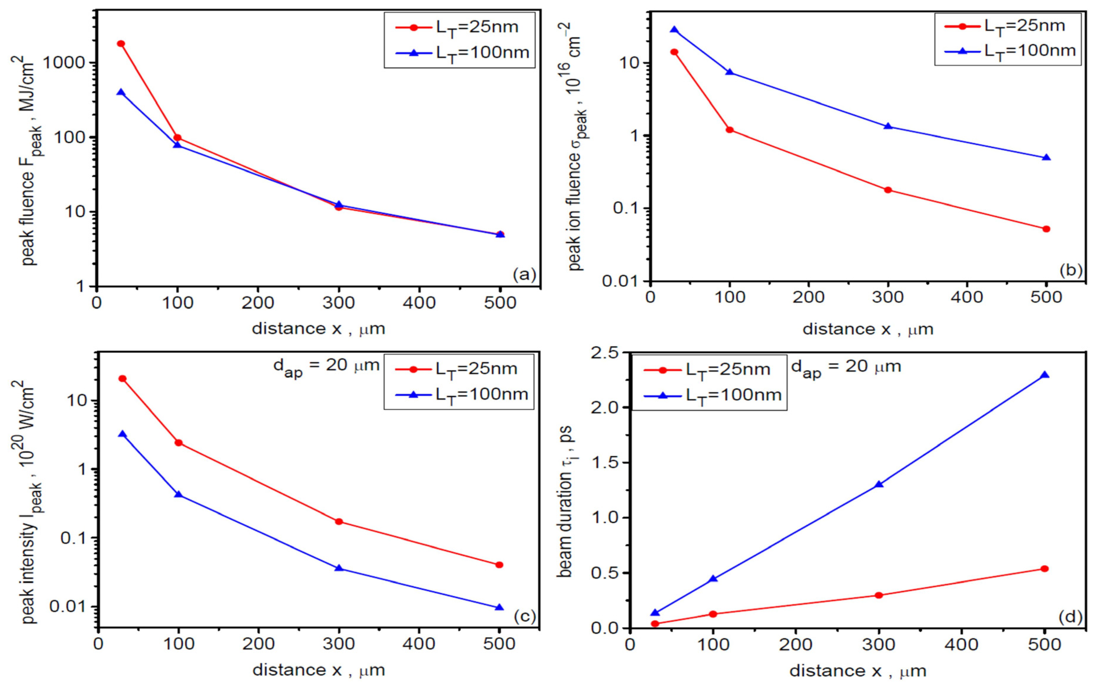- The energy fluence, ion fluence, and beam intensity decreases rapidly, while the ion pulse duration increases with increasing distance between the beam detection point and the ion target (these changes occur while the ion energy remains constant). Changing this distance can therefore be a simple and effective way to control these parameters, e.g., in ion beam-target interaction experiments.