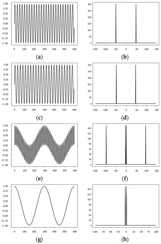 Moiré effect in one-dimensional grids. Signals are shown in the left column; their spectra are shown in the right column. (a–d) Signals with slightly different periods; (e,f) superimposed (overlapped) signals; (g,h) filtered moiré patterns. Adapted from [2].