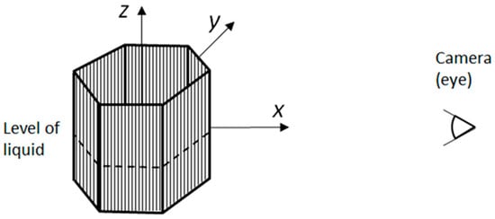 Consider a symmetric 3D object filled with a refractive substance (such as water or glass), as shown in Figure 3. The surface of the liquid is horizontal (parallel to the xy-plane). We used line grids with vertical lines (perpendicular to the xy-plane) attached to the object’s surfaces without folds or gaps. Thus, we consider flat facets (parallelepiped) and curved (cylinder).
