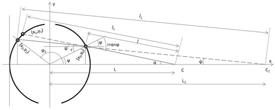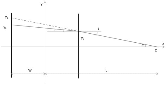 The geometry of our problem (see Figure 7) is similar to the central projection discussed in [2]. Note the second, imaginary point C2 at the intersection of the extended refracted ray with the abscissa; L2 and l2 are distances to it. The angles α and ψ are small, but the angles φ1 and φ2 are not.