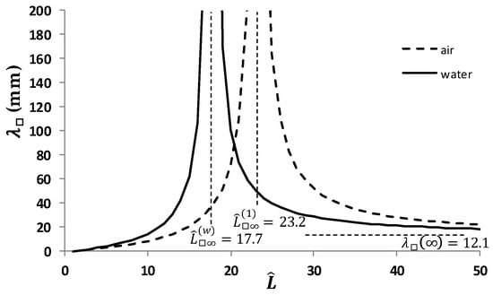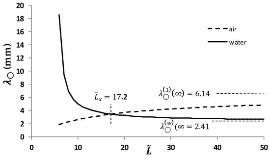 The derivative of the function under the modulus in Equation (62) (the inverse k in Equation (61)) is positive, i.e., the function under the modulus increases. However, in water, the right branch of the period (the absolute value) decreases, so the functions in water and in air intersect. The intersection point Lx can be found from the condition