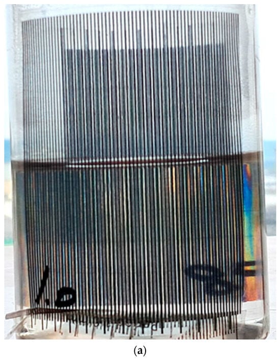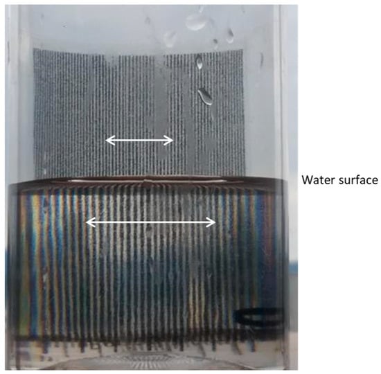 The moiré magnification was measured by the apparent size of the entire grid attached to the far surface (the white lines with arrows in Figure 11 and Figure 12) photographed through the container above and below the surface of the liquid (the camera axis was horizontal, directed along the x-axis to the origin).