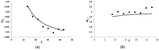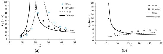 The graph is shown in Figure 13a for the rectangular water tank with 2W = 4.8 cm; the deviation of experiments from the theory (Equation (48)) is 0.2%. In the cylinder with R = 3.7 cm (see Figure 13b), the deviation from Equation (62) is 7.8%.