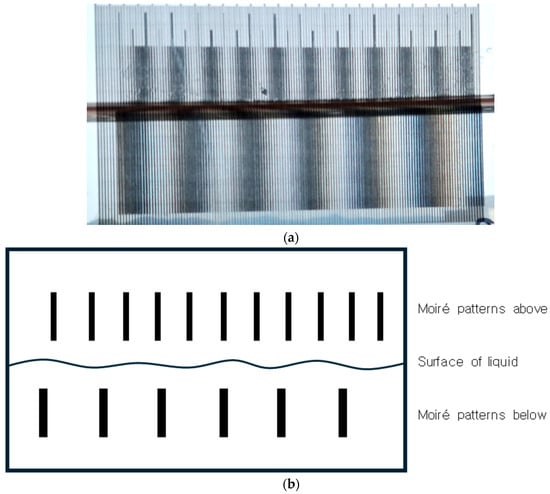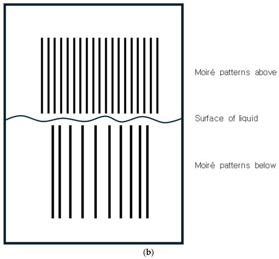 Potential applications include measuring the refractive index and liquid level. The measured period of grid lines or moiré patterns, as well as the use of Equations (27) or (55), can indicate the refractive index; however, the latter will have higher accuracy due to the magnification. Liquid level can be measured by comparing the spatial frequencies of moiré patterns above and below the surface.